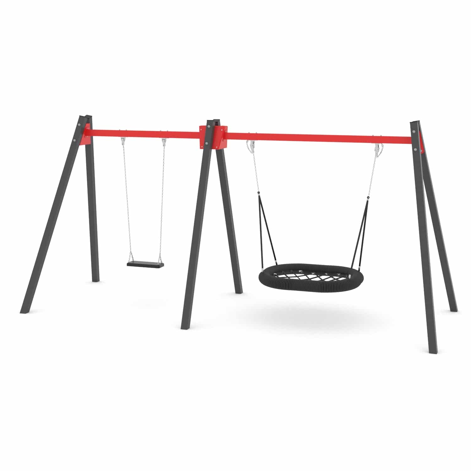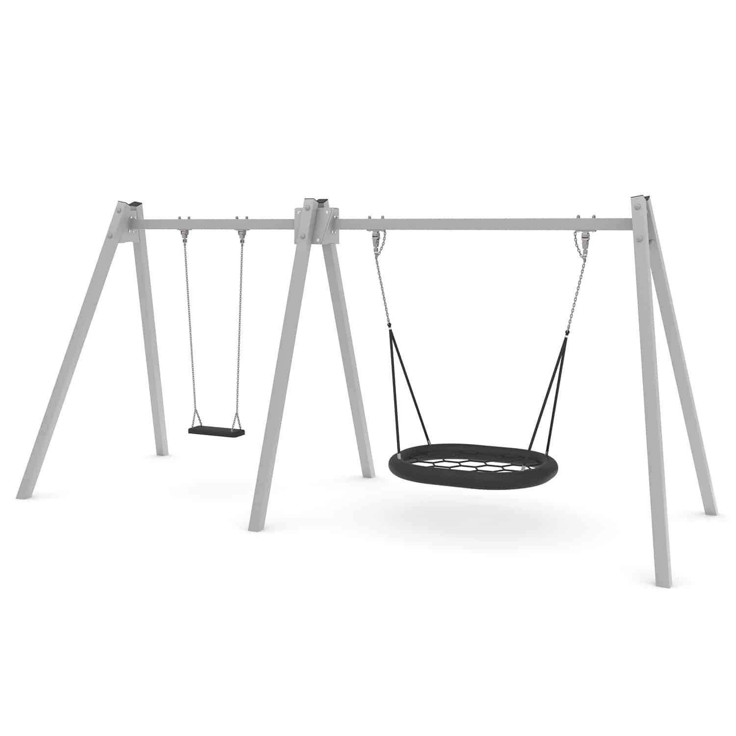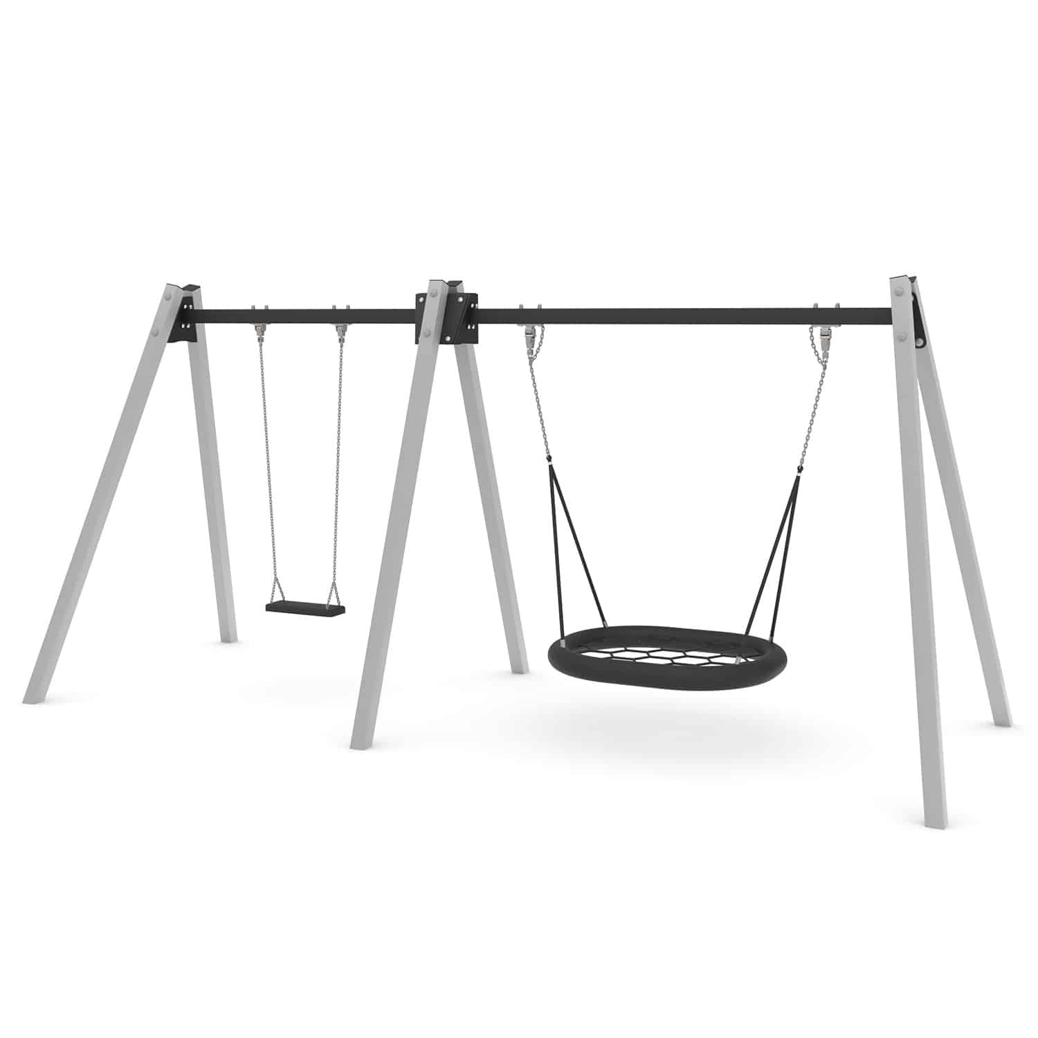 Strak vormgegeven Schommelcombi met een vogelnestschommel en standaard zitje waarbij optioneel voor een ander zitje gekozen kan worden.