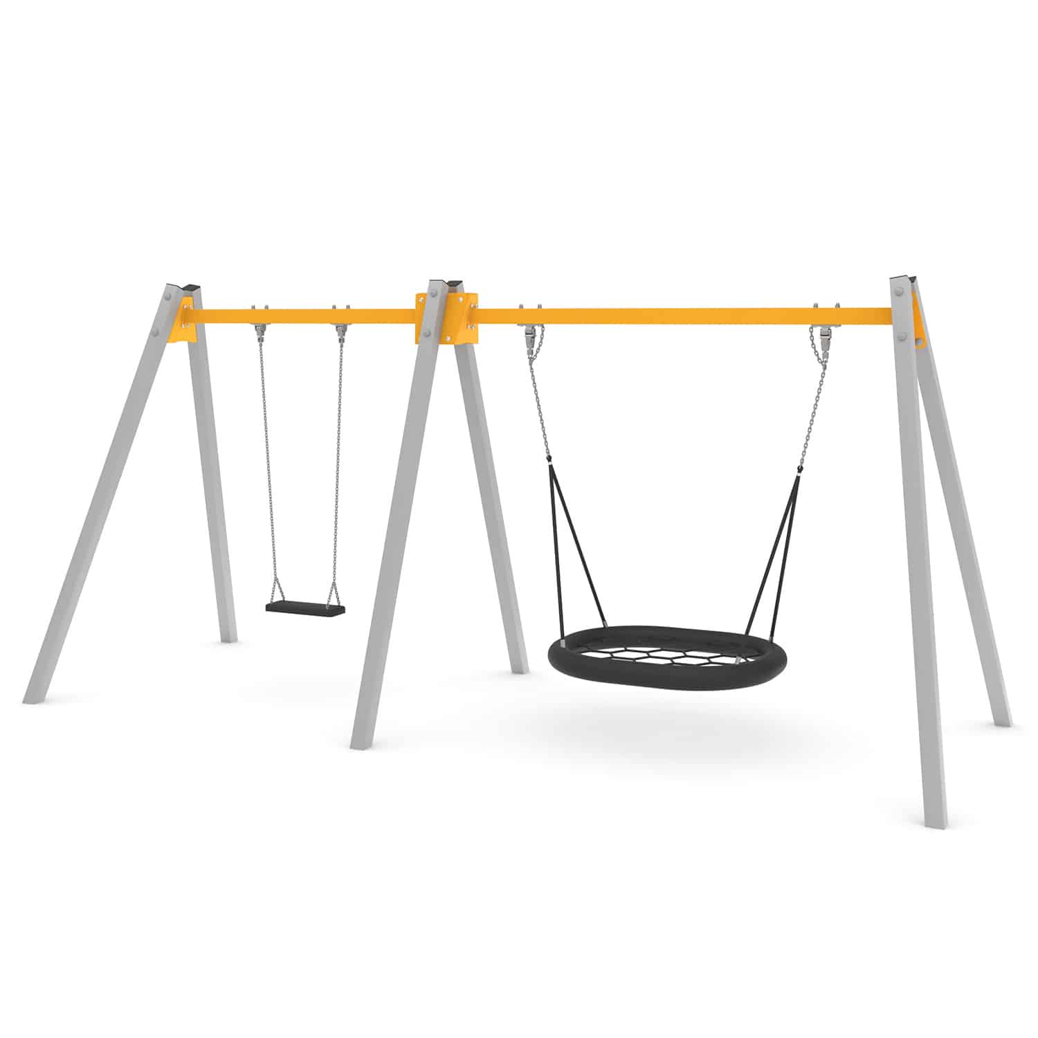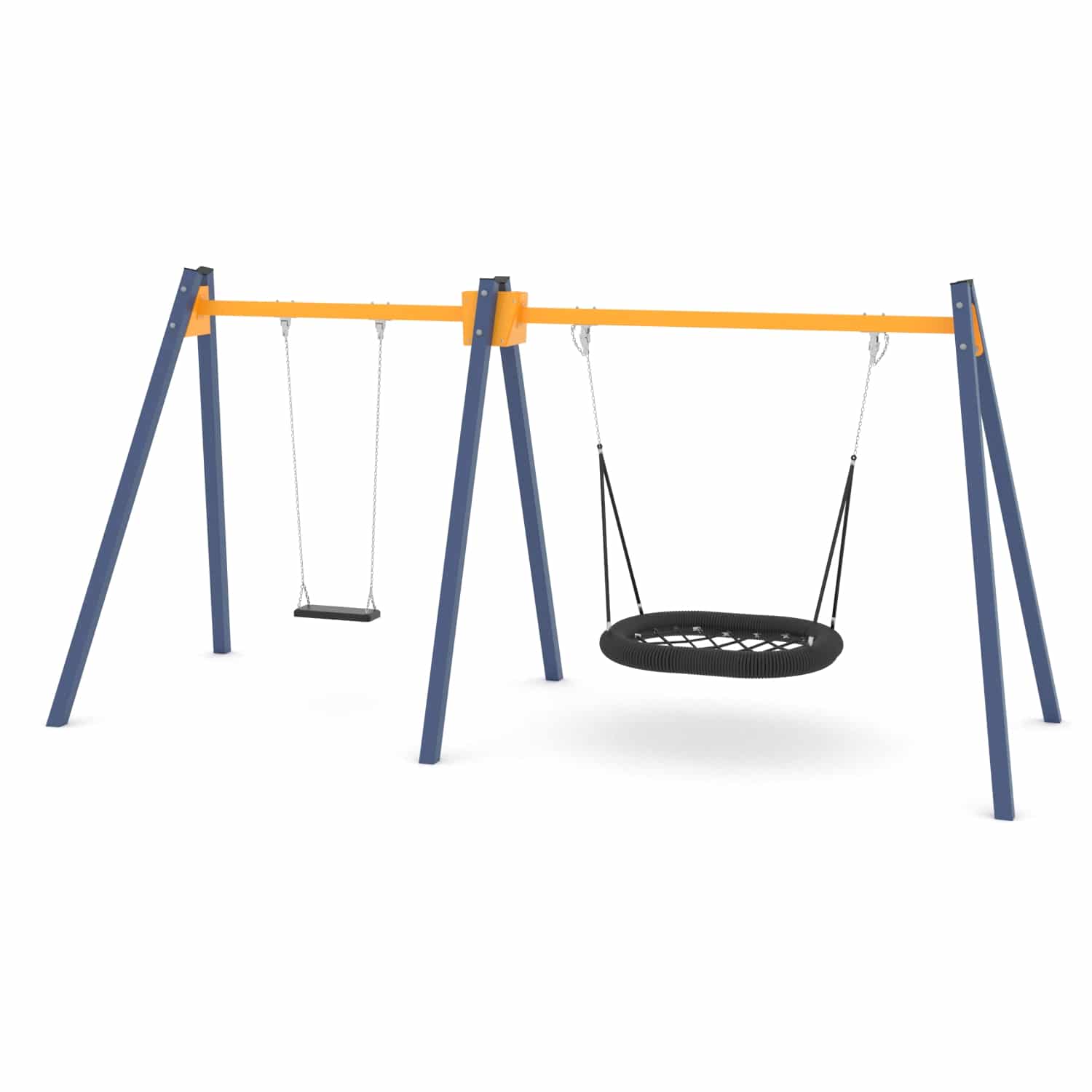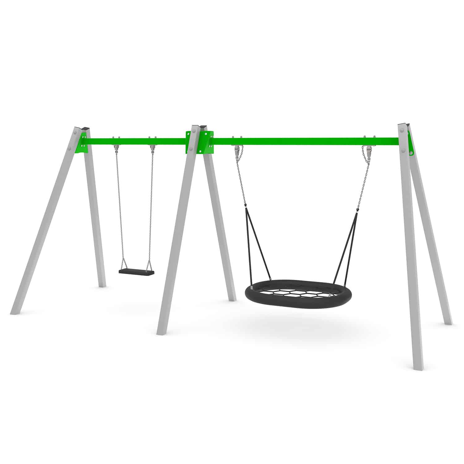 Strak vormgegeven Schommelcombi met een vogelnestschommel en standaard zitje waarbij optioneel voor een ander zitje gekozen kan worden.