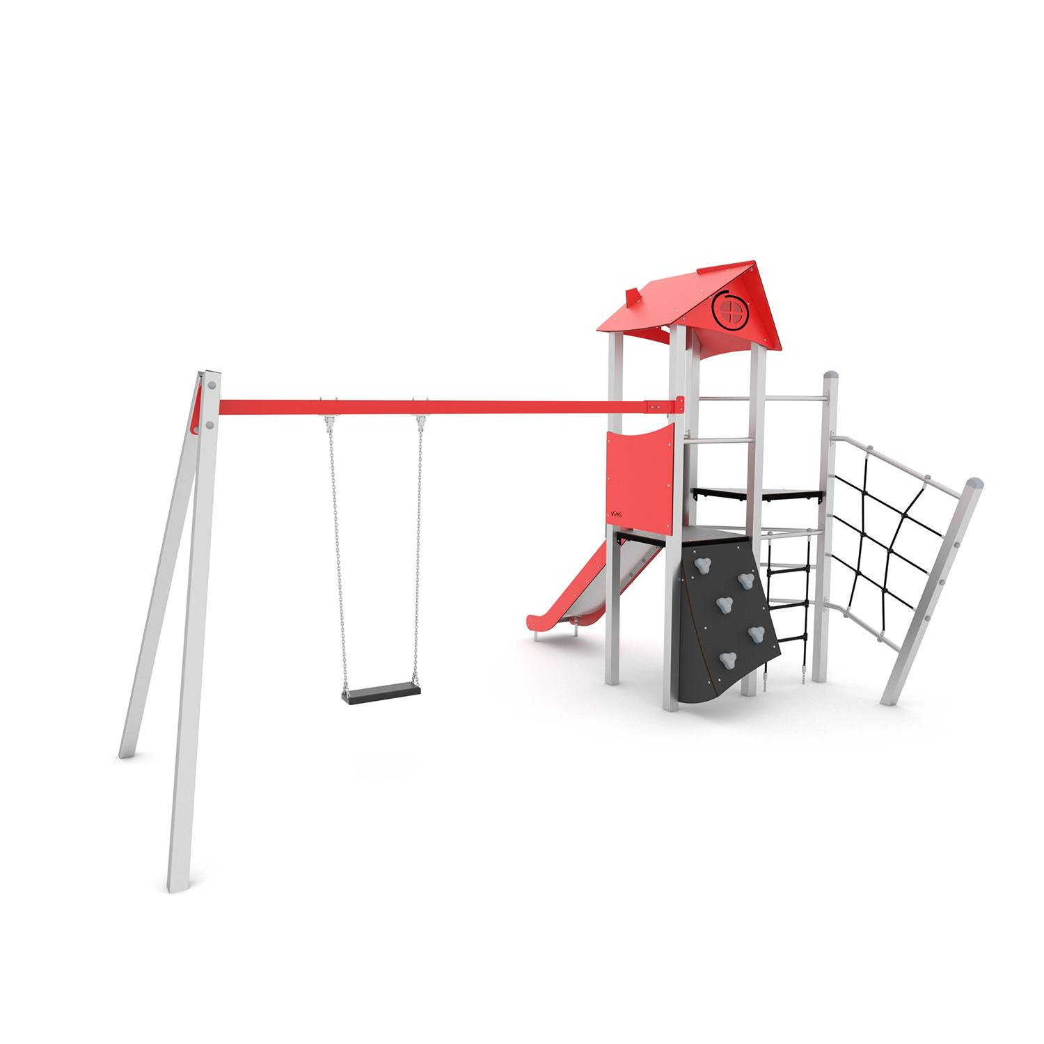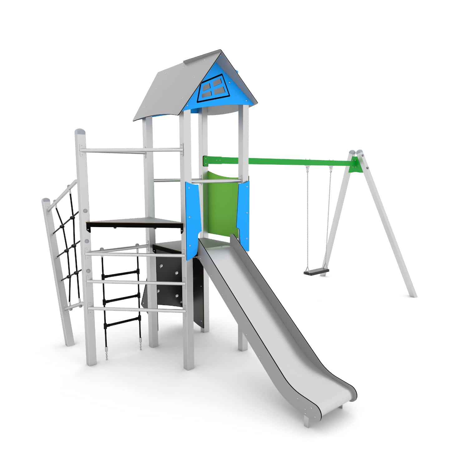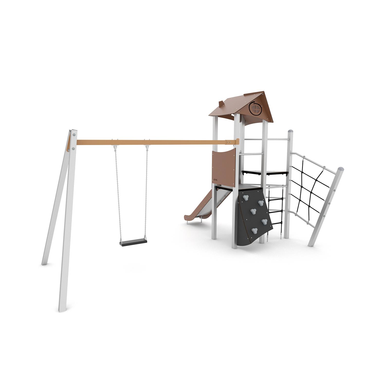 Speelcombinatie met klimnet, klimwand, glijbaan en enkele schommel