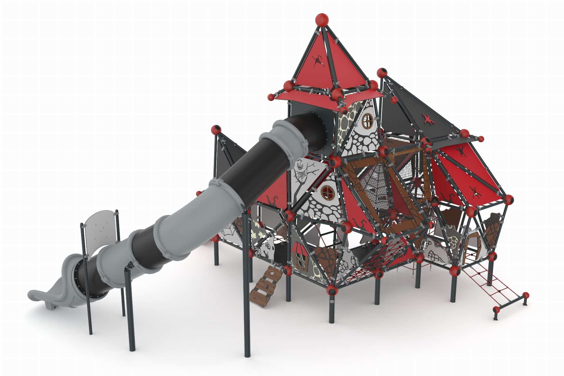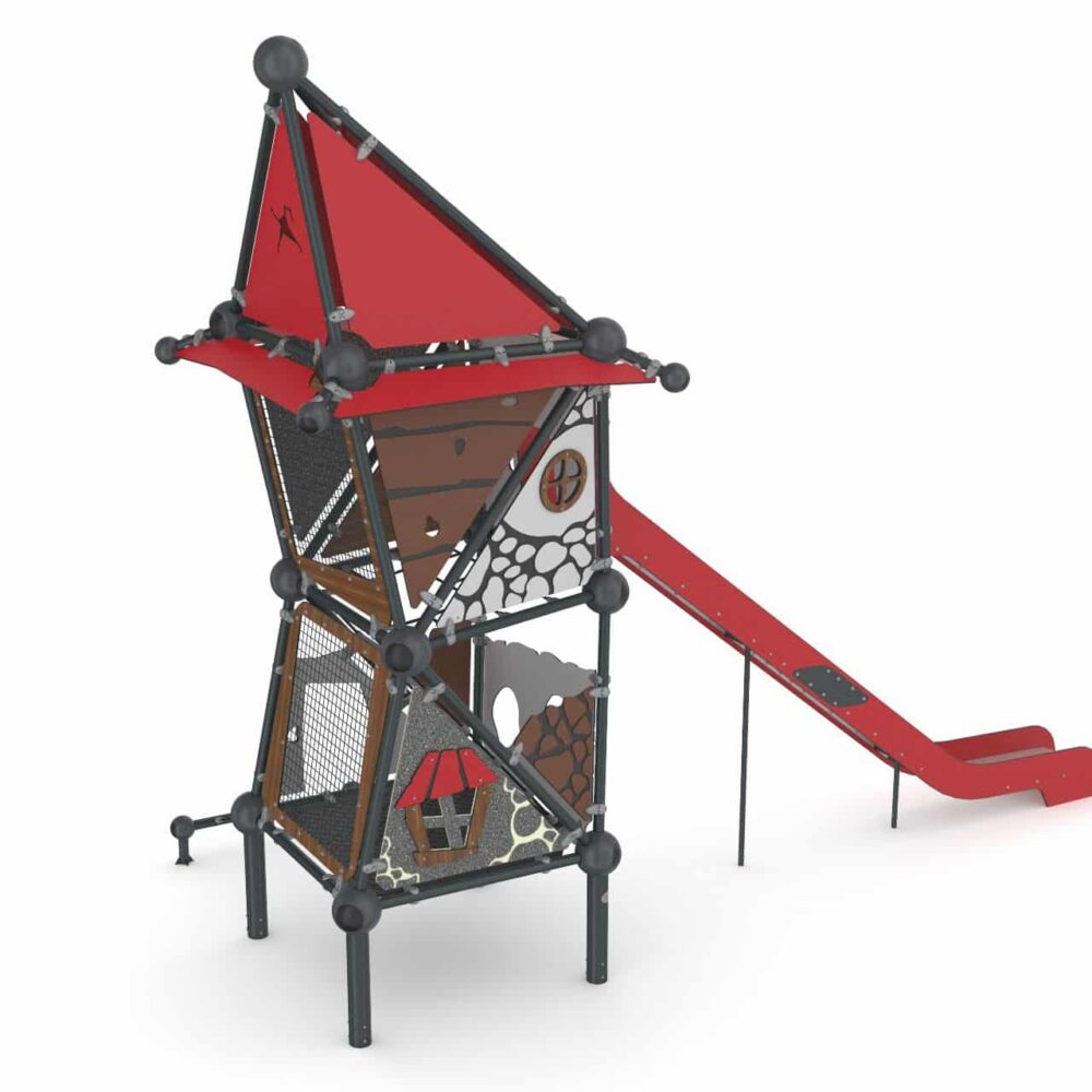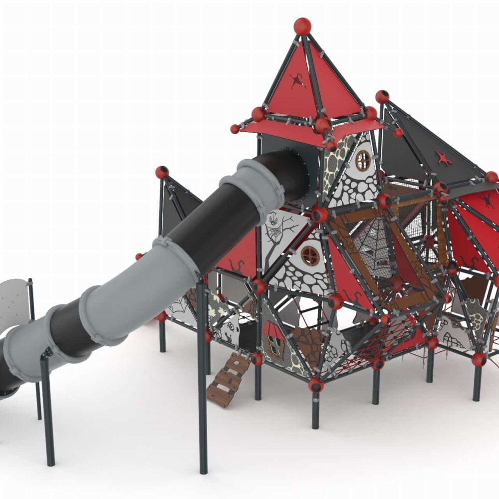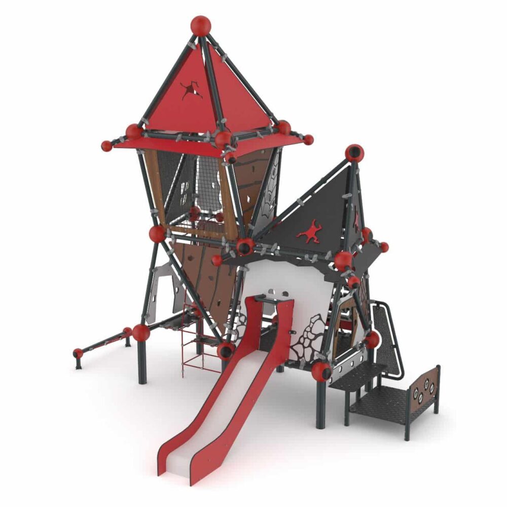 Speelcombinatie met klimnet, klimwand, glijbaan en enkele schommel