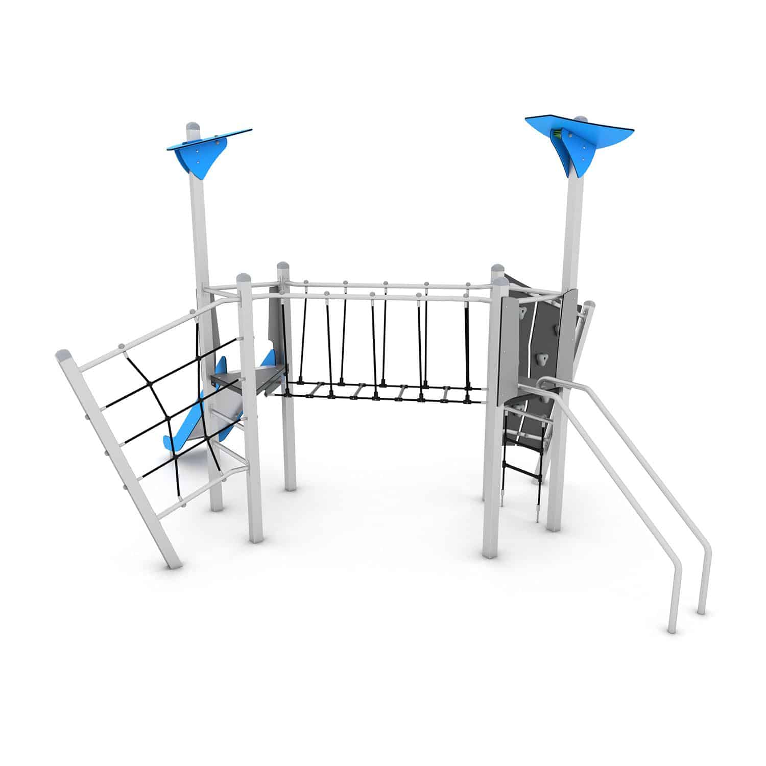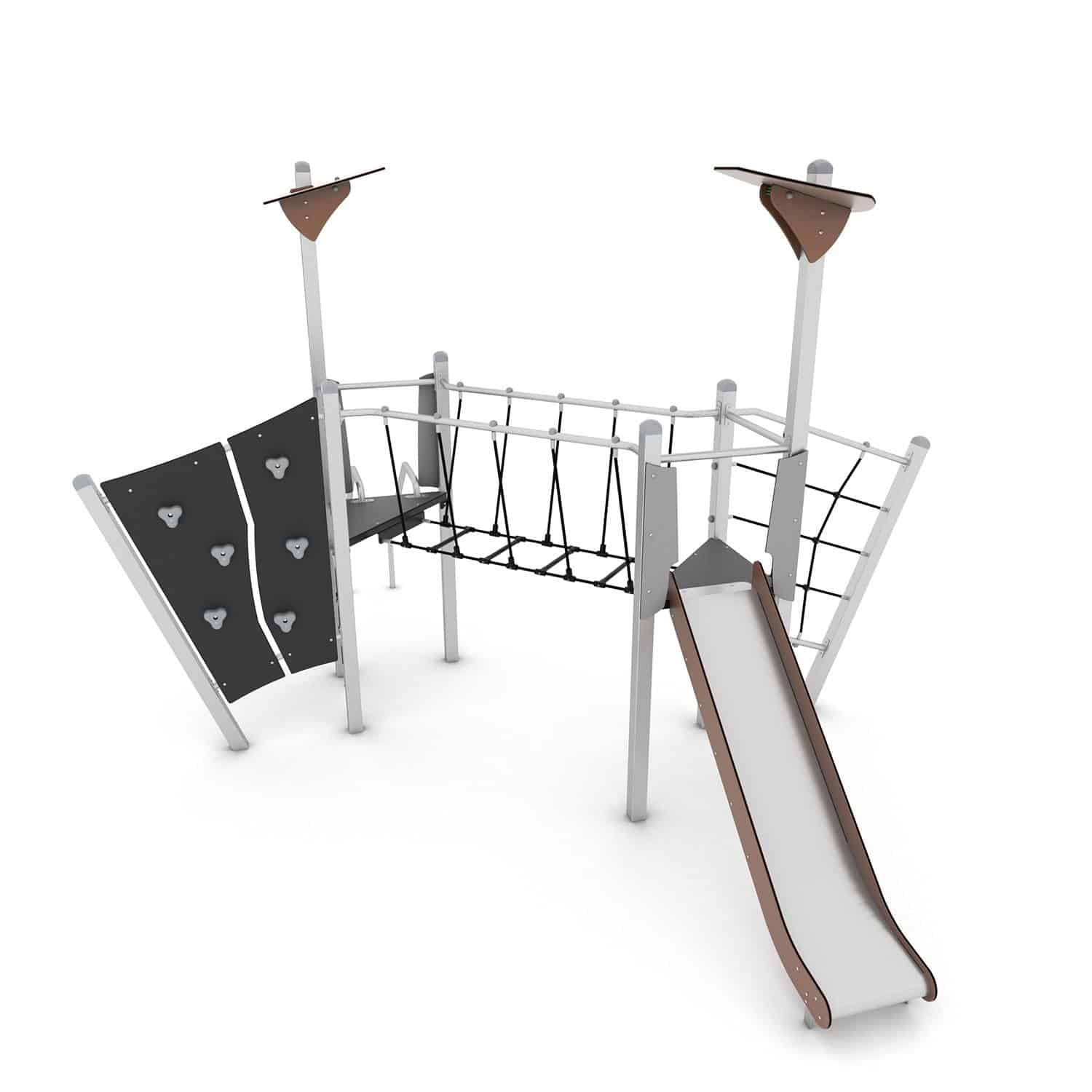 Speelcombinatie met 2 torens, klimnet, klimwand, glijbaan, glijstangen en netbrug