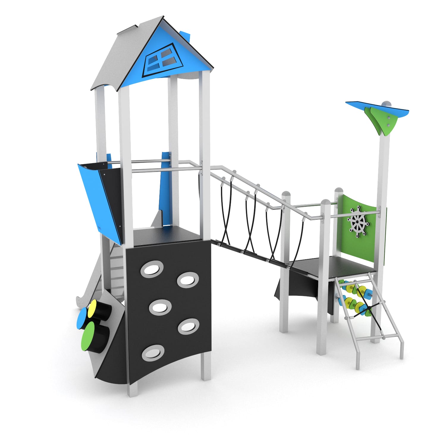 Speelcombinatie met 2 torens, klimwand, glijbaan en brug