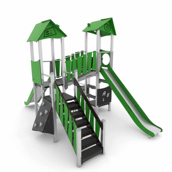 Speelcombinatie met 2 torens, trap, klimwand, brug en twee glijbanen