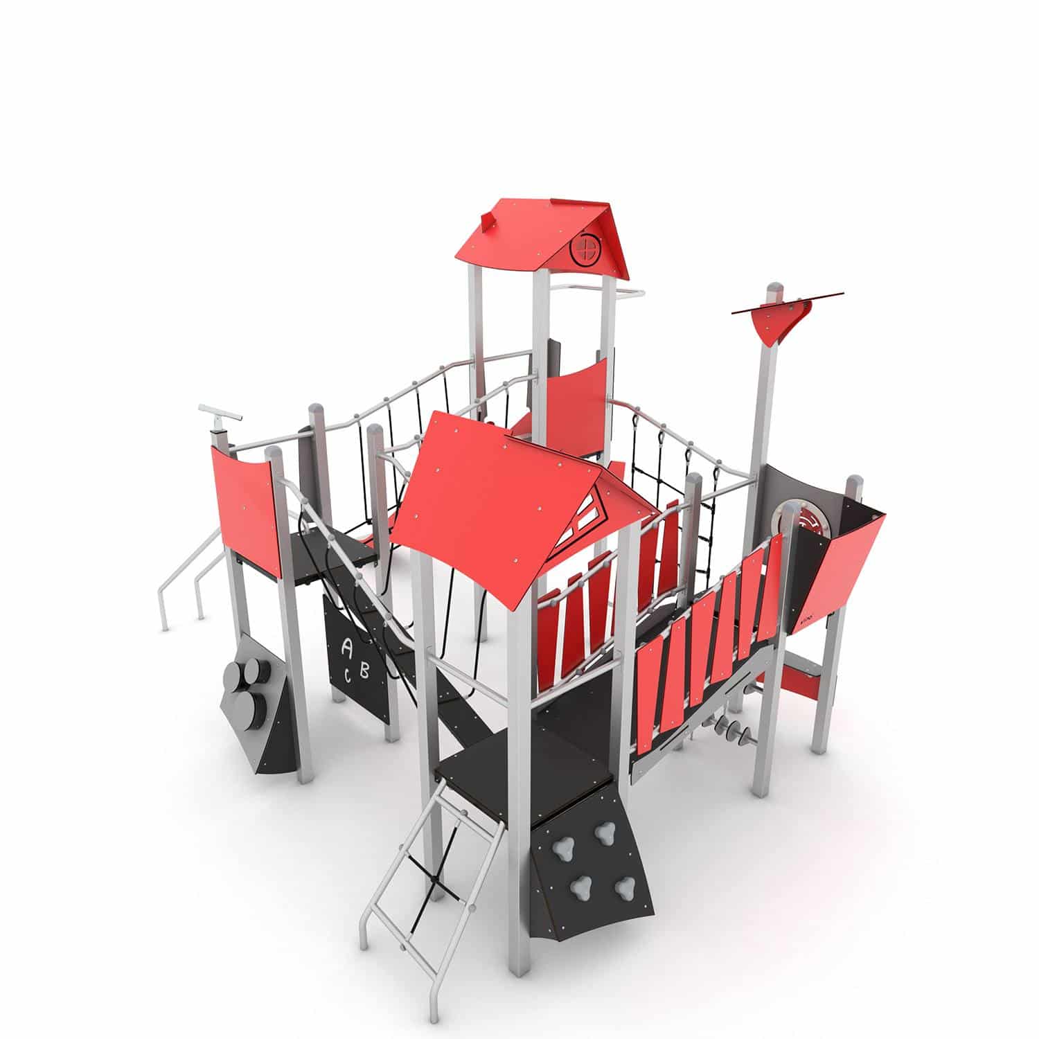 Speelcombinatie vierkant met 4 torens, bruggen, brandweerpaal, glijstangen en een glijbaan