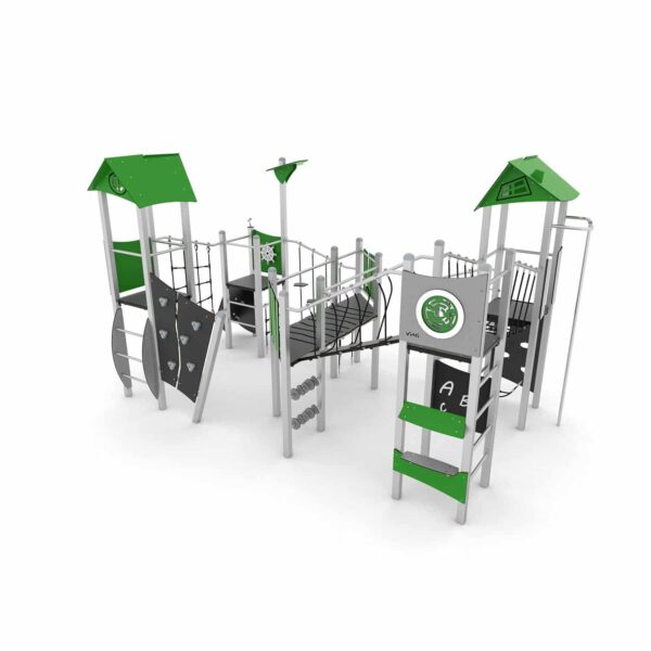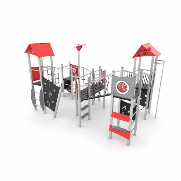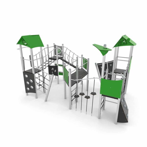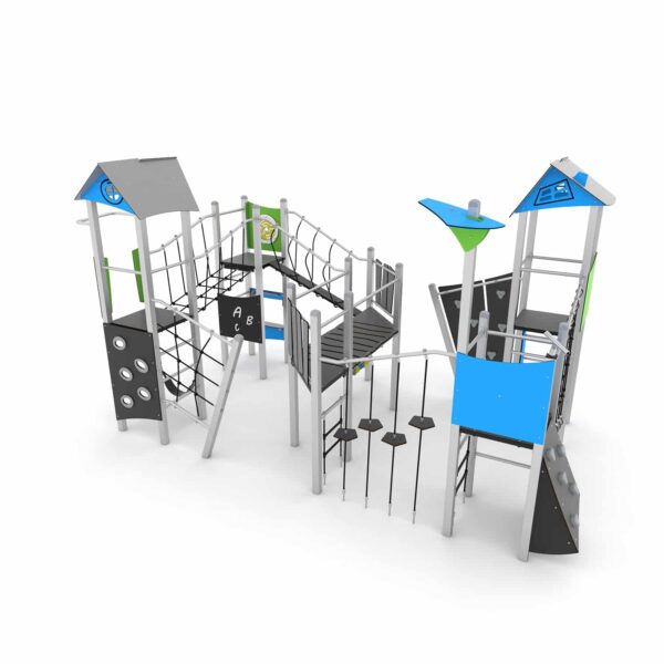 Speelcombinatie met 6 torens, bruggen, glijstang, klimnetten en klimwanden