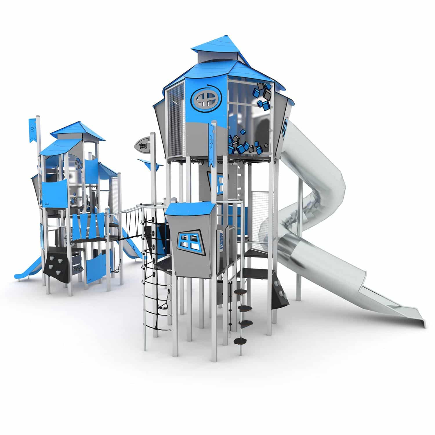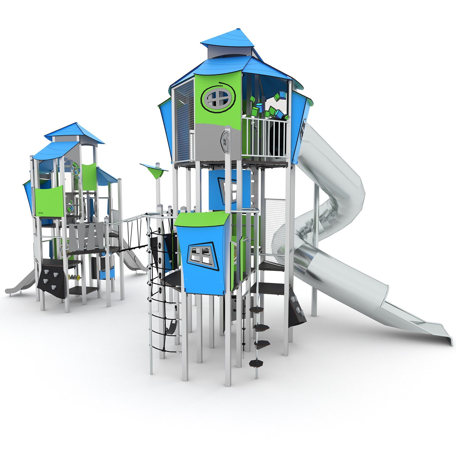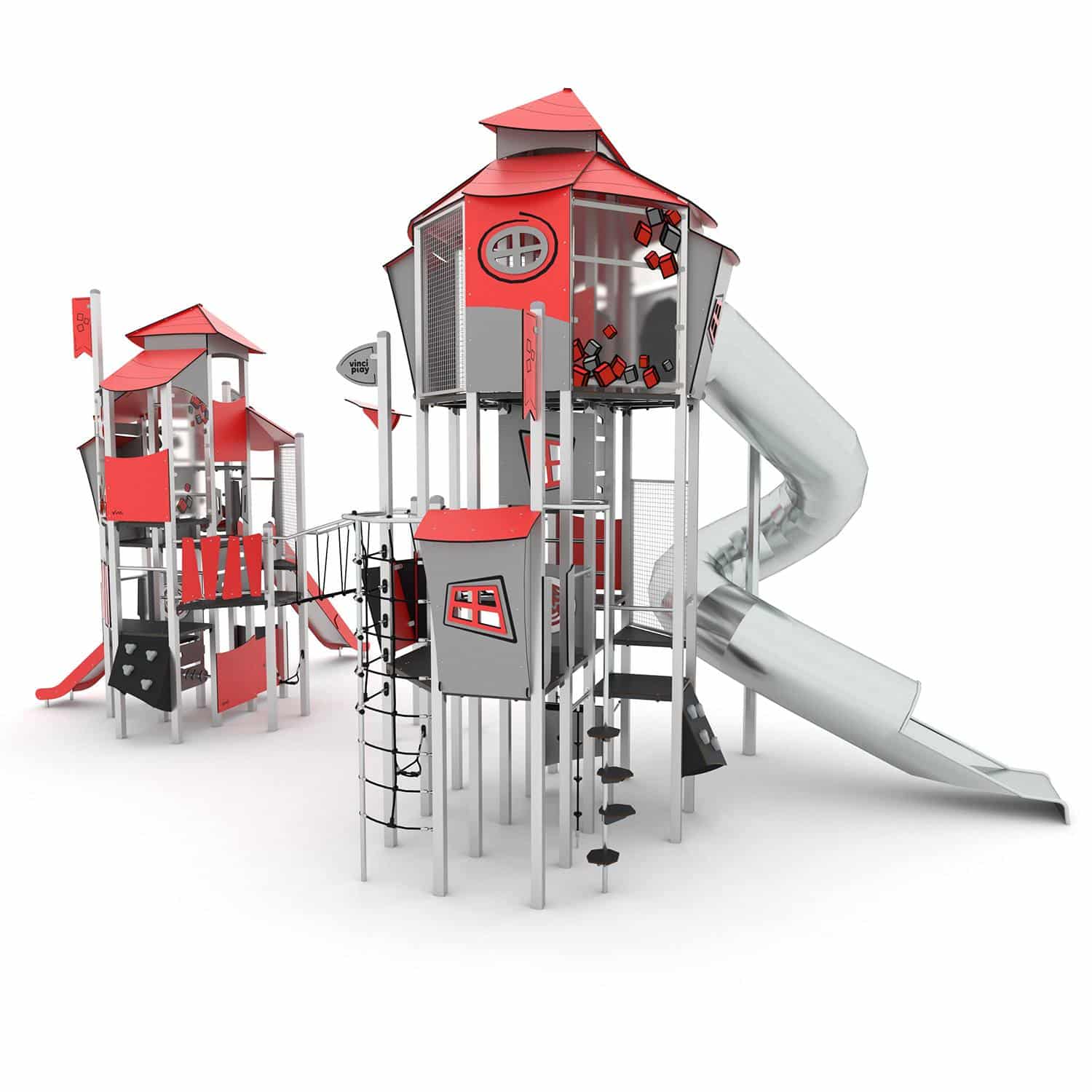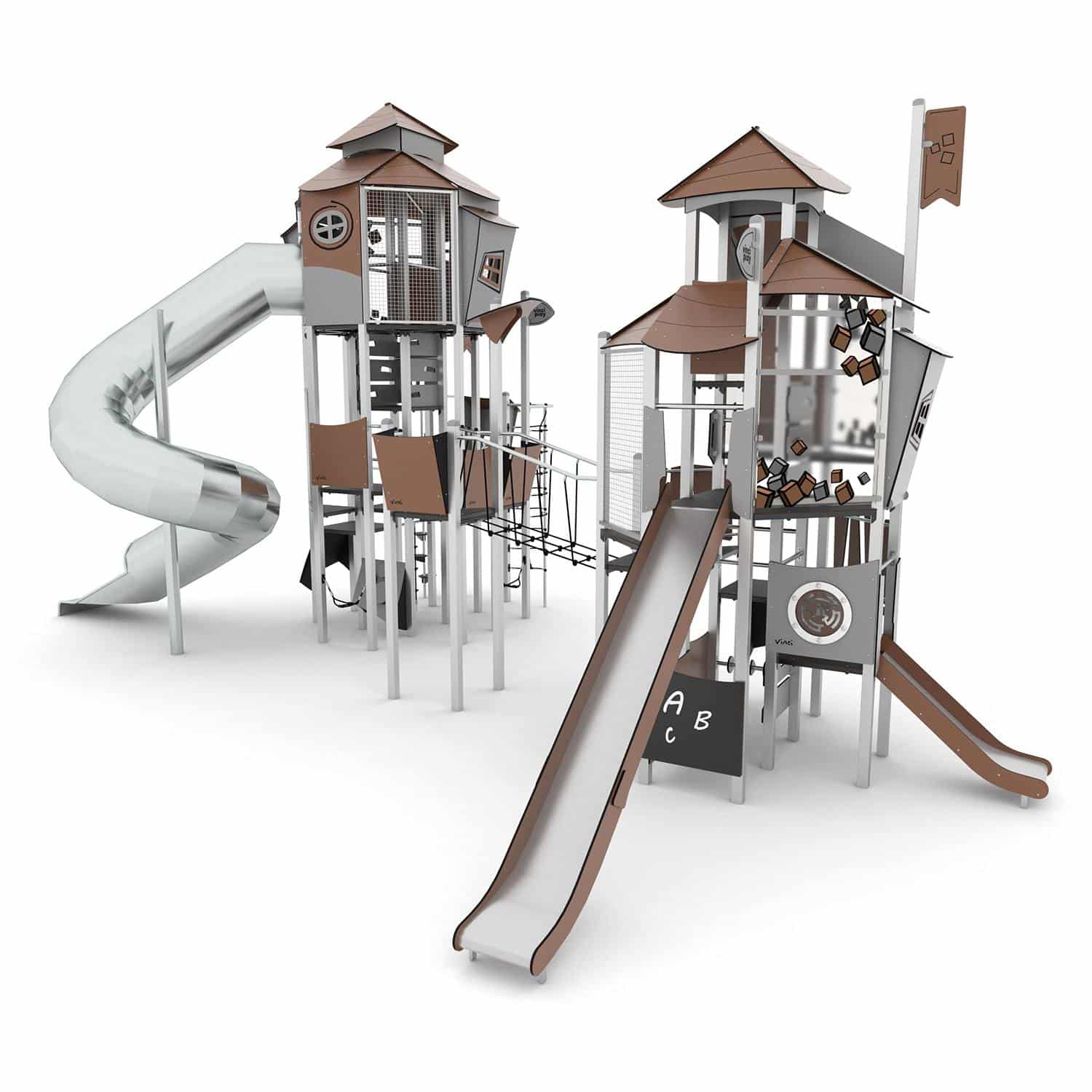 Dubbel multilevel speeltoren met buisglijbaan en netbrug