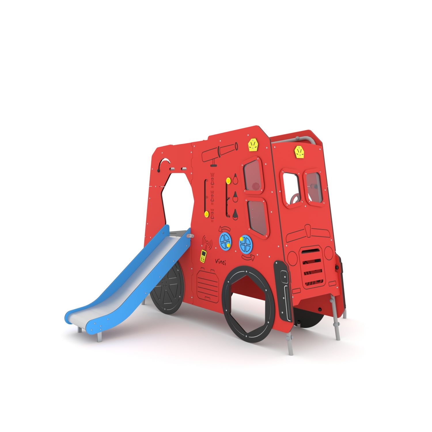 Brandweerauto met glijbaan, klimnet, klimwand en diverse manipulatieve elementen