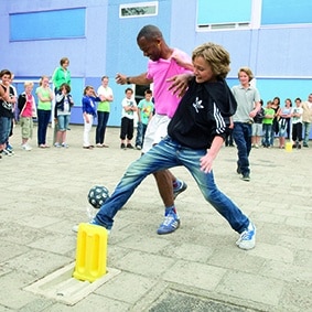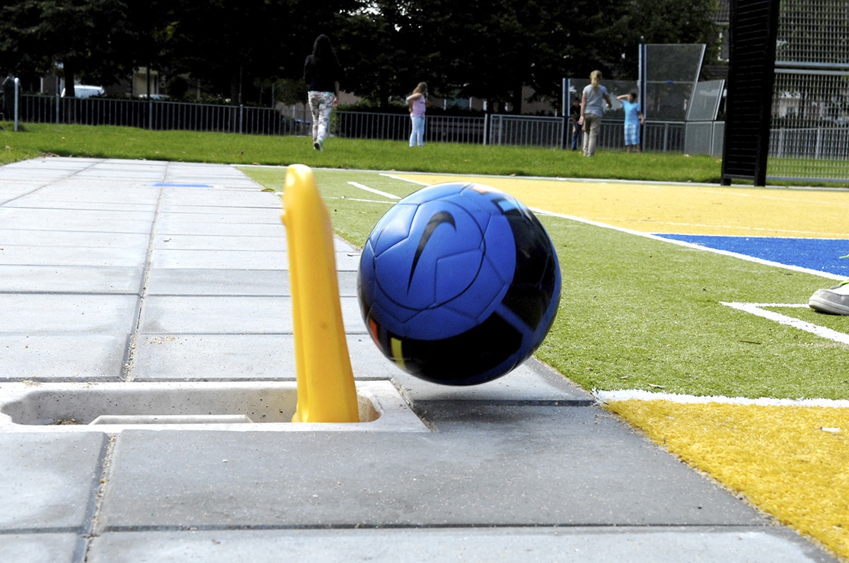 Paaltjesvoetbal blijft immens populair en heeft zijn voordelen als de bal laag moet blijven. Het gekleurde voetbalpaaltje is verankerd in een zware betonvoet met de afmetingen van een stoeptegel. Ingeklapt steekt het paaltje slechts 12 mm boven het maaiveld uit. Door de platte vorm en ronde hoeken rijden auto’s en fietsen er probleemloos over heen. Uitgeklapt garandeert dit voetbalpaaltje uren speelplezier voor kinderen van alle leeftijden. Door meerdere paaltjes tegenover elkaar te plaatsen ontstaat vanzelf een veldje.