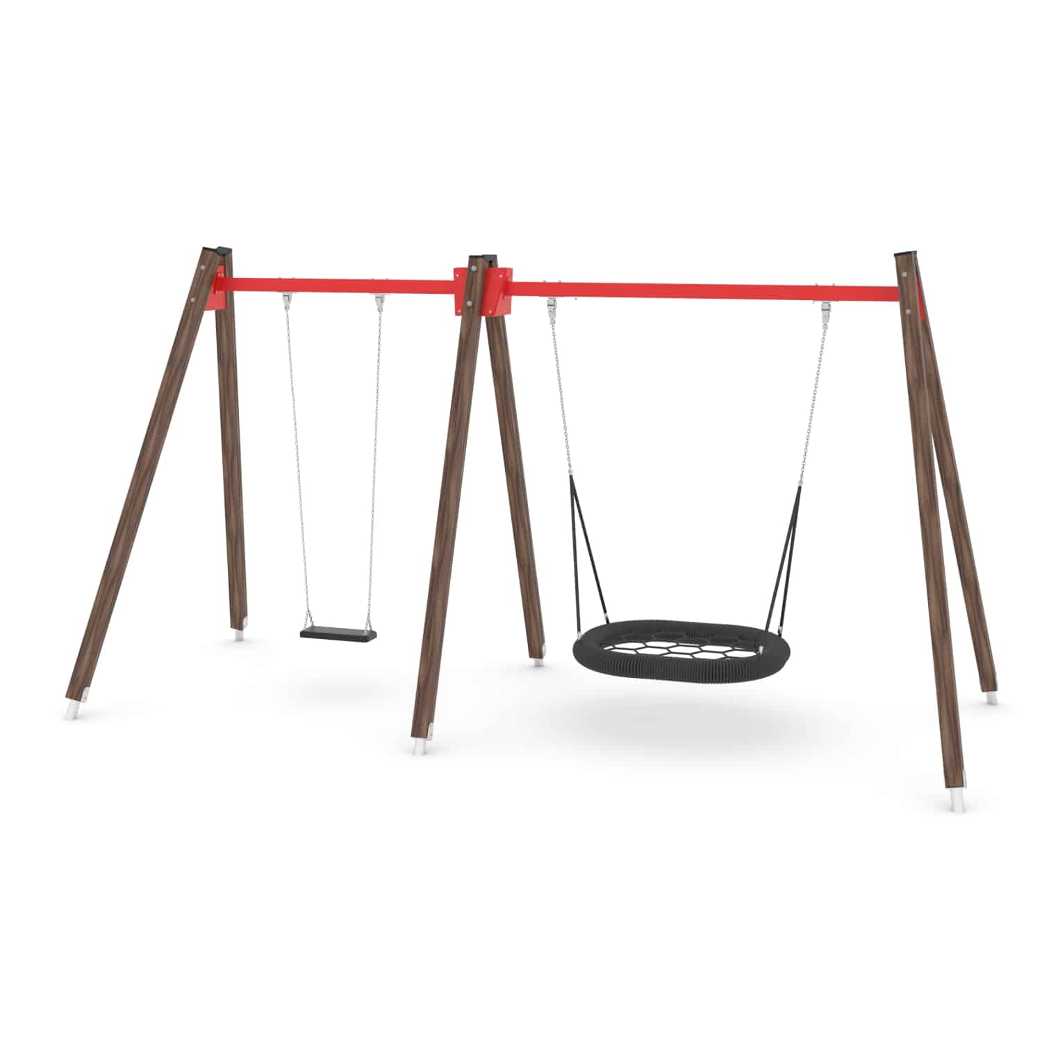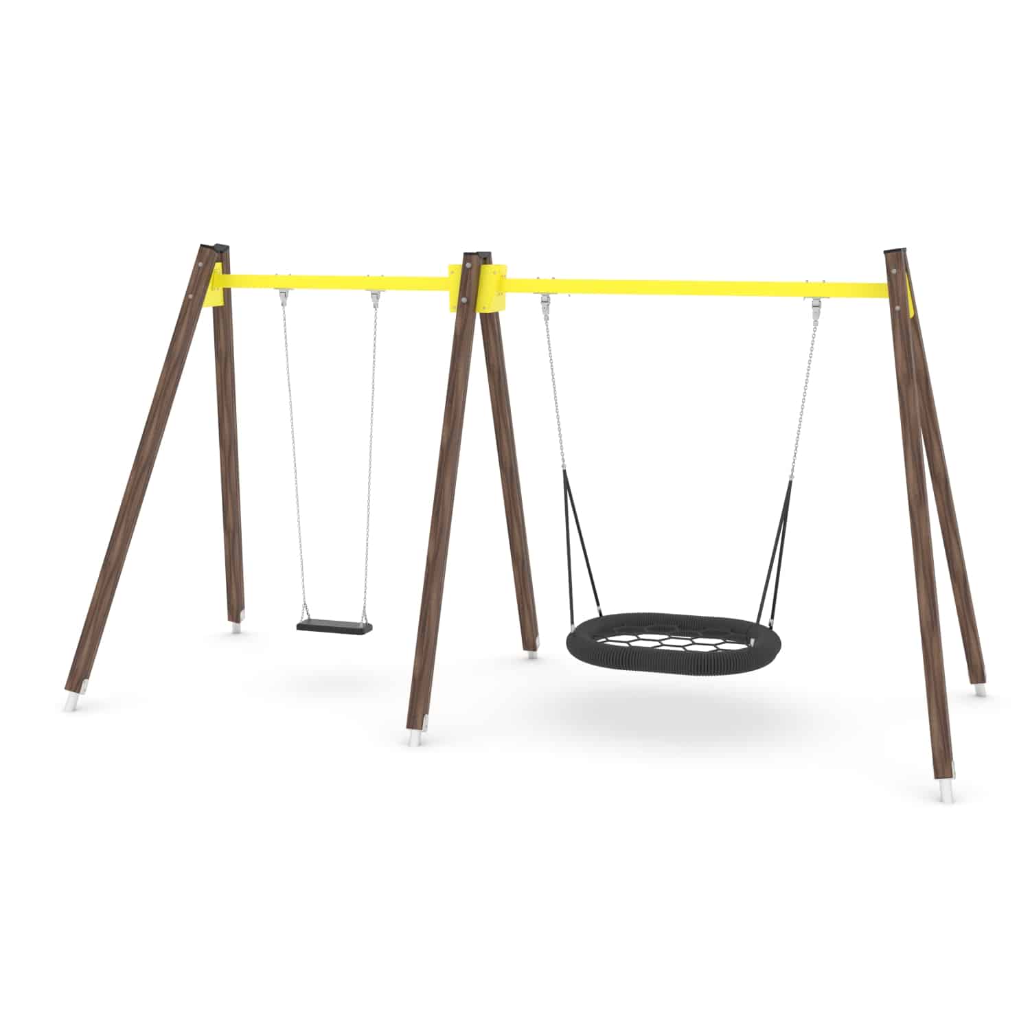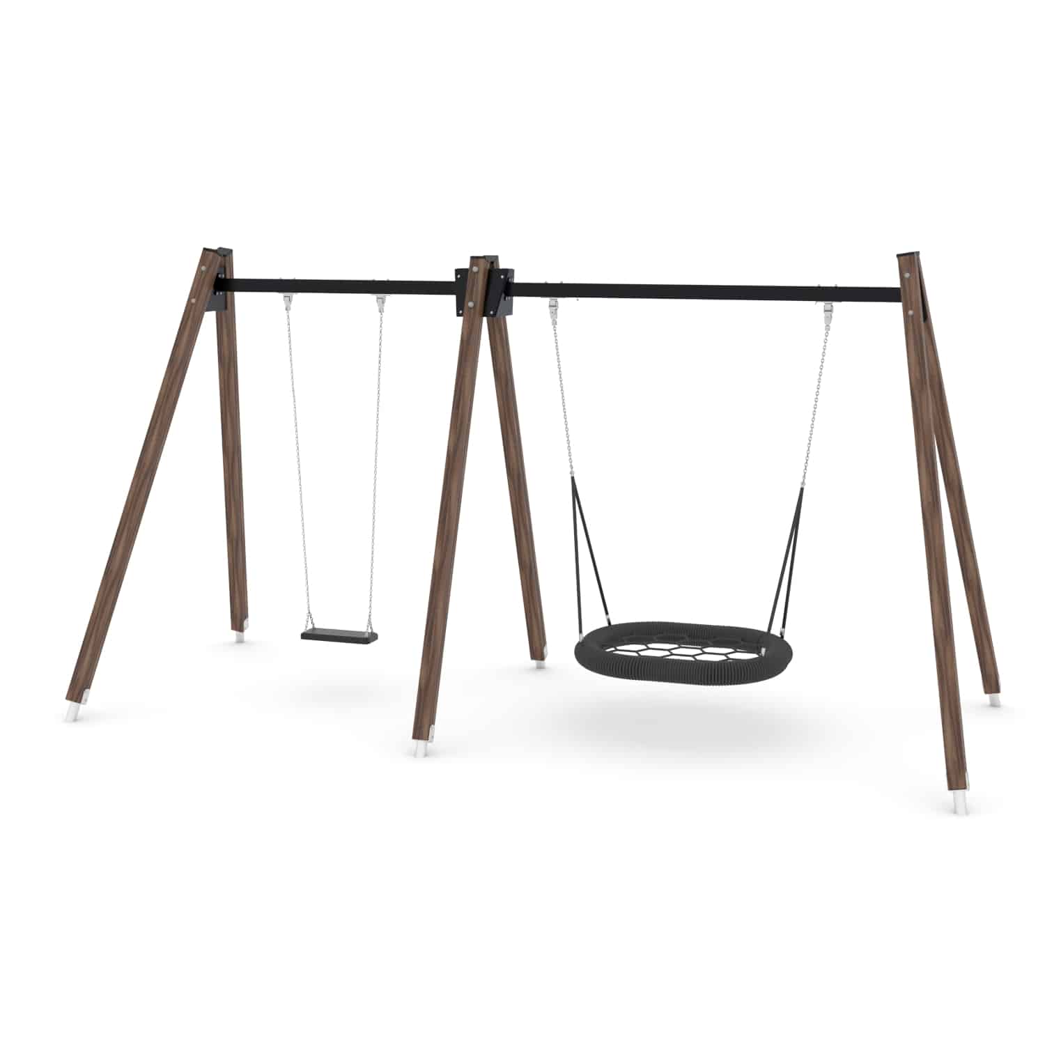 Strak vormgegeven Schommelcombi met een vogelnestschommel en standaard zitje waarbij optioneel voor een ander zitje gekozen kan worden.
