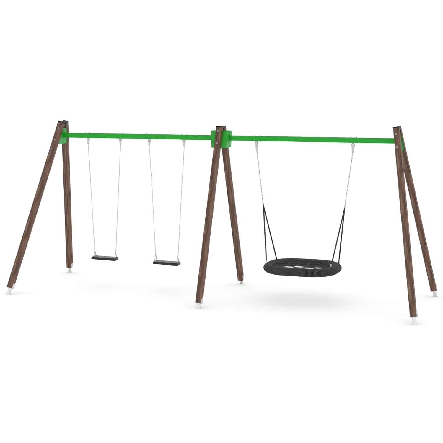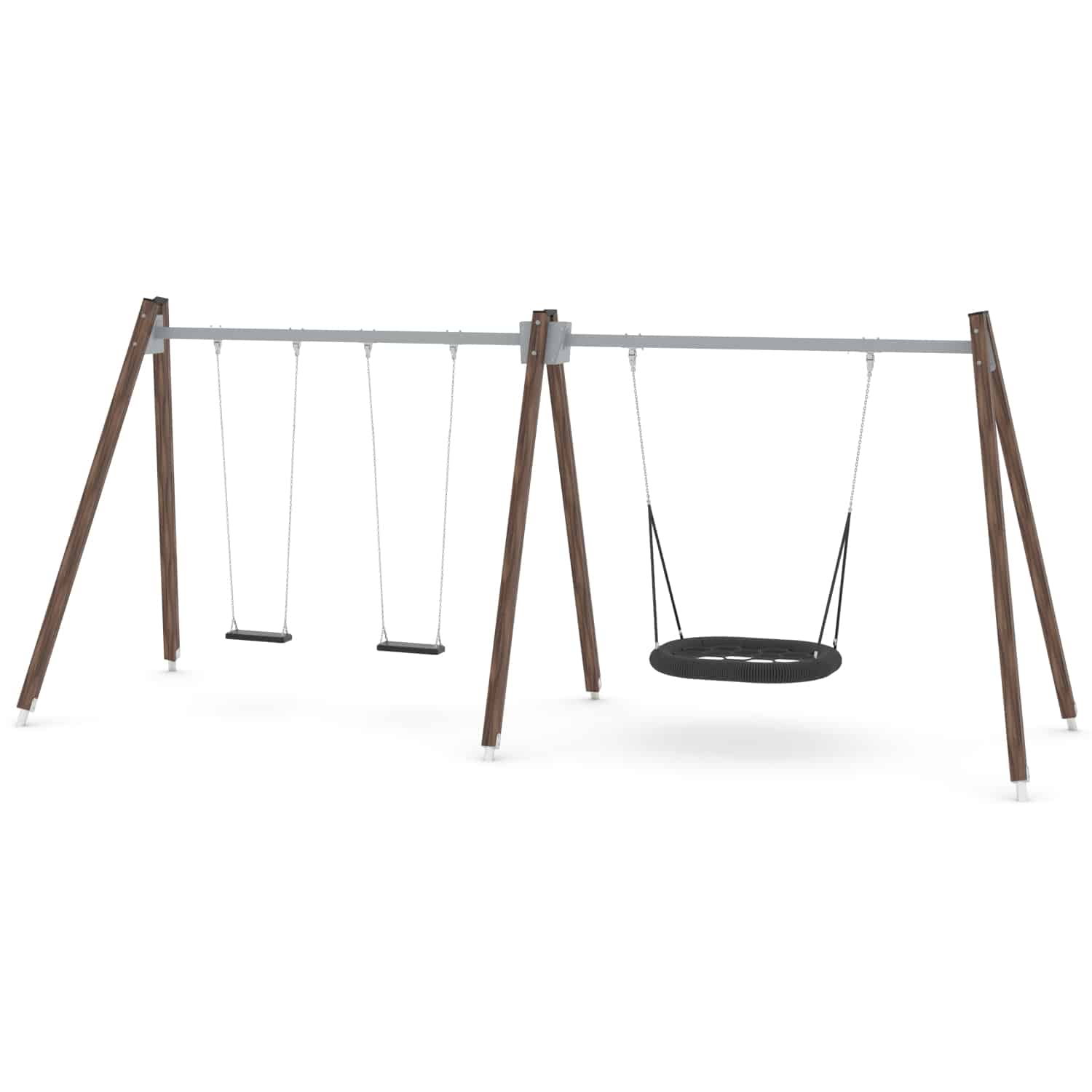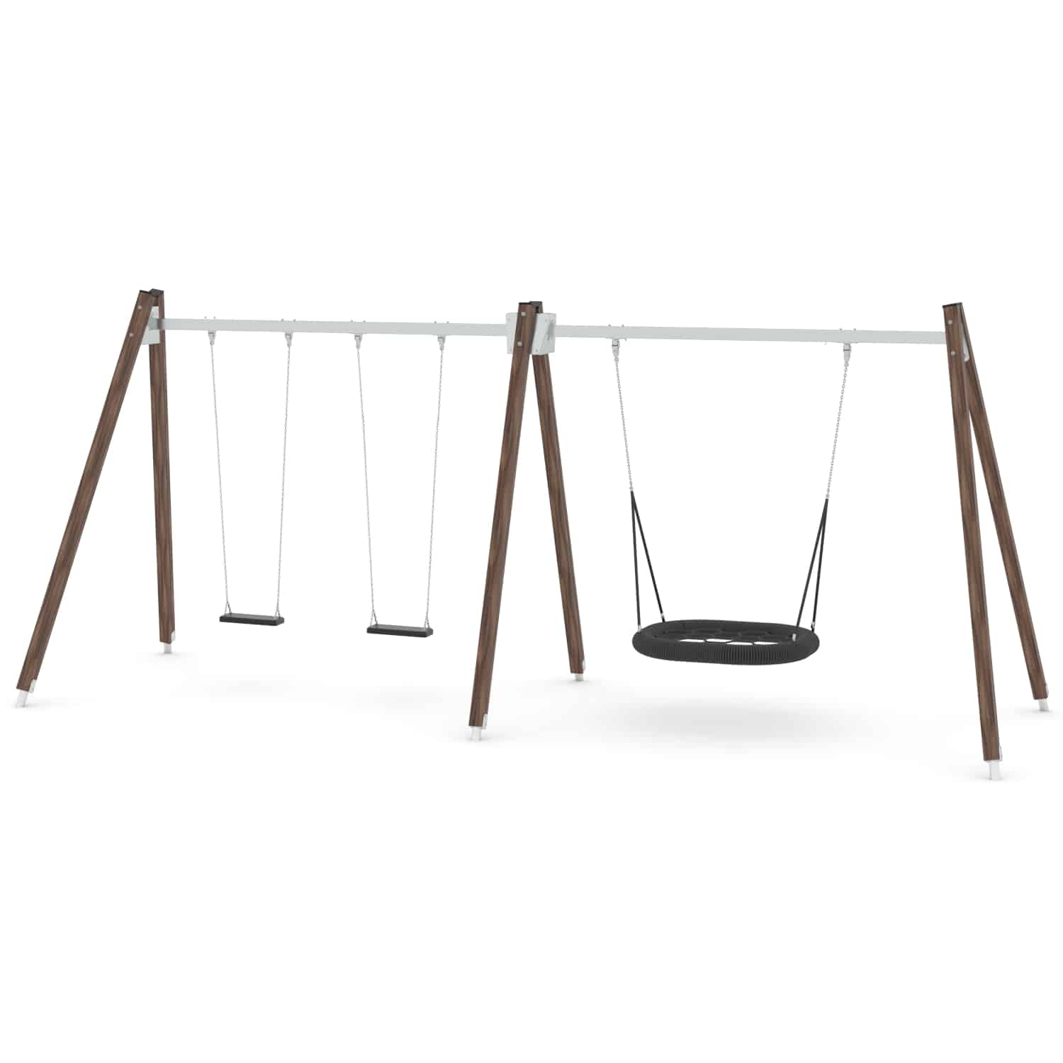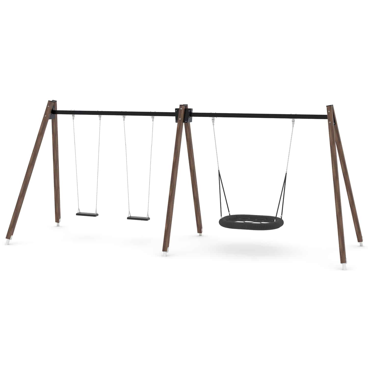 Strak vormgegeven Schommelcombi met een vogelnestschommel en twee standaard zitjes waarbij optioneel voor andere zitjes gekozen kan worden.
