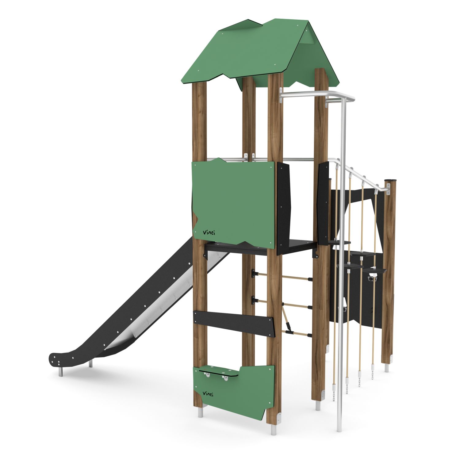 Door de WoodenSeries optioneel uit te rusten met bv groene HPL panelen i.p.v. de standaard HPDE panelen, passen deze toestellen ook zeer goed in de z.g. natuurlijke speeltuinen.
