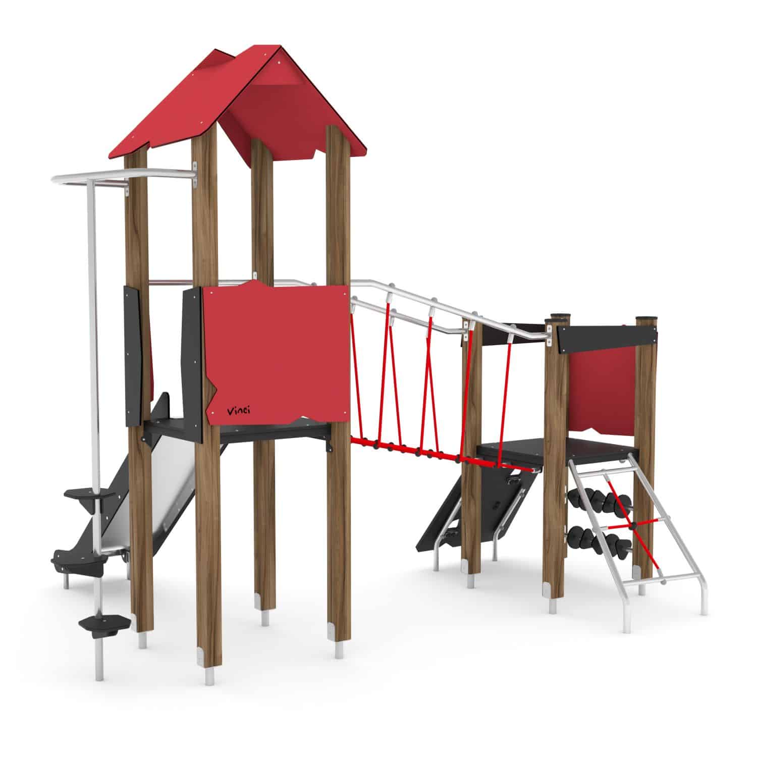 Speelcombinatie met 2 torens, glijbaan, netbrug en klim-/glijpaal