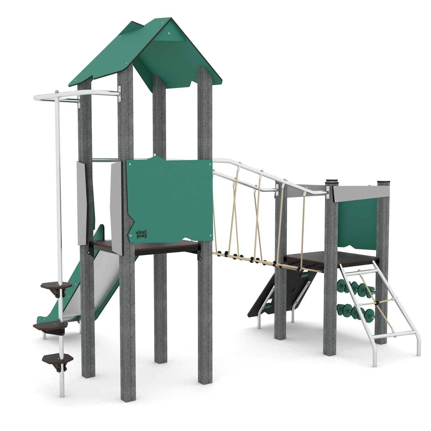 Speelcombinatie met 2 torens, glijbaan, netbrug en klim-/glijpaal