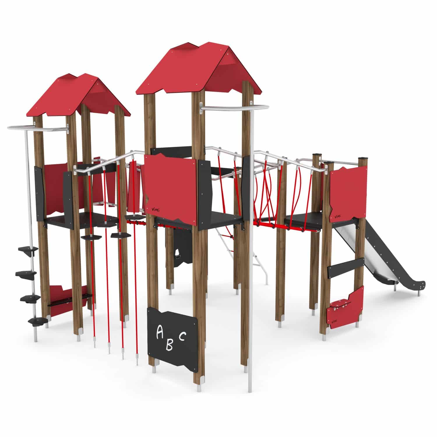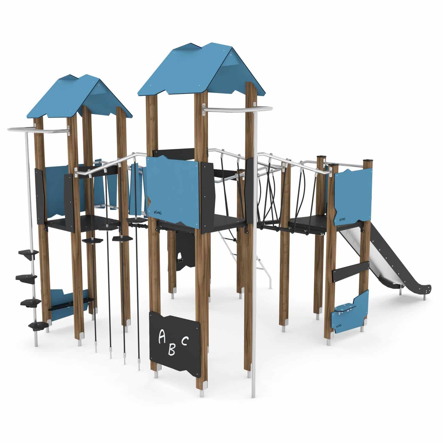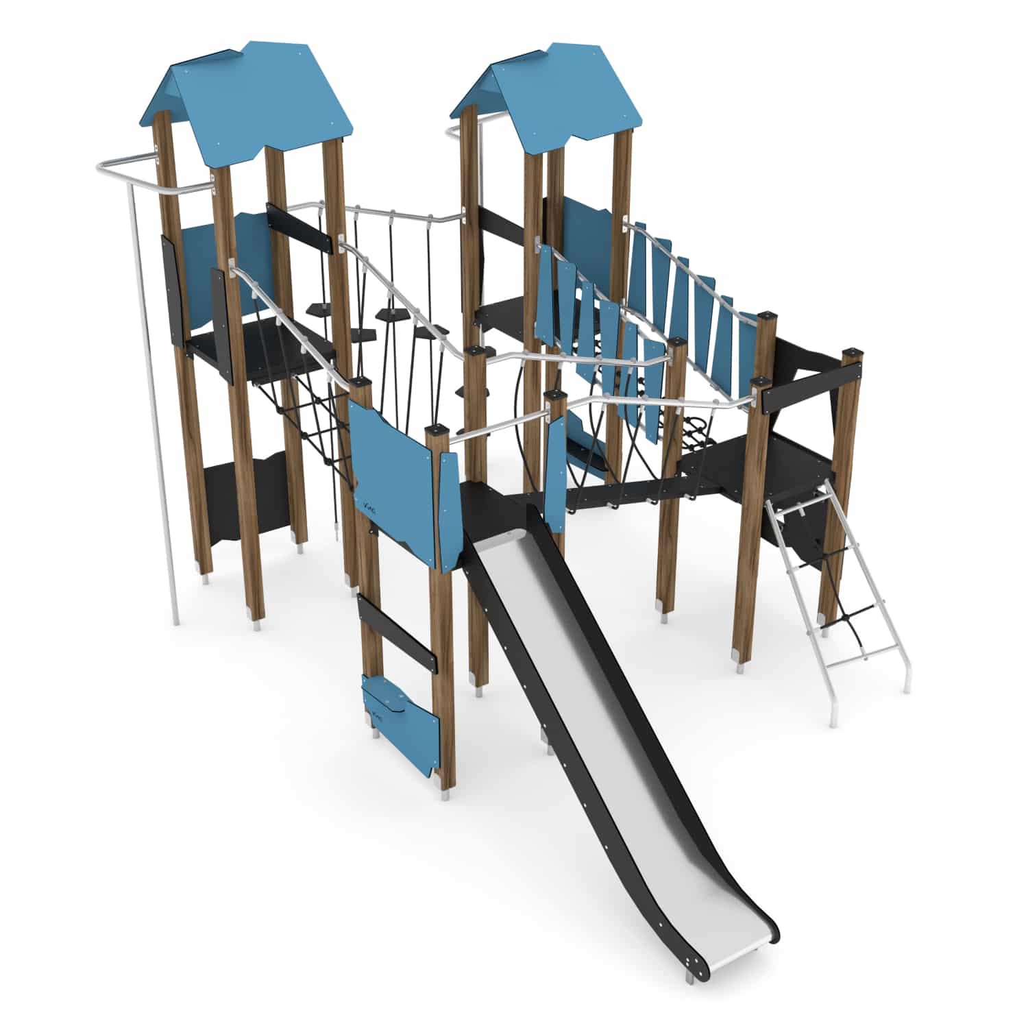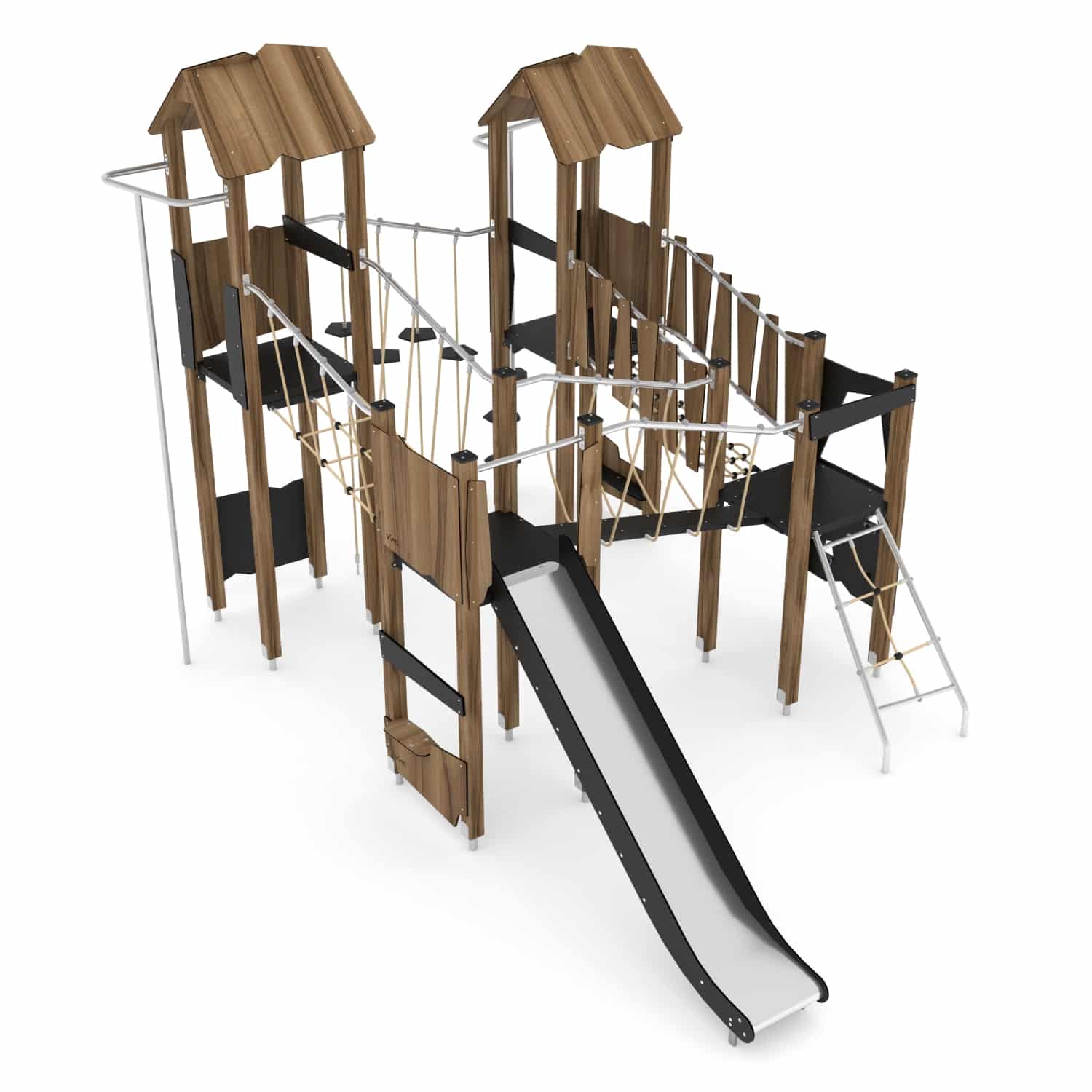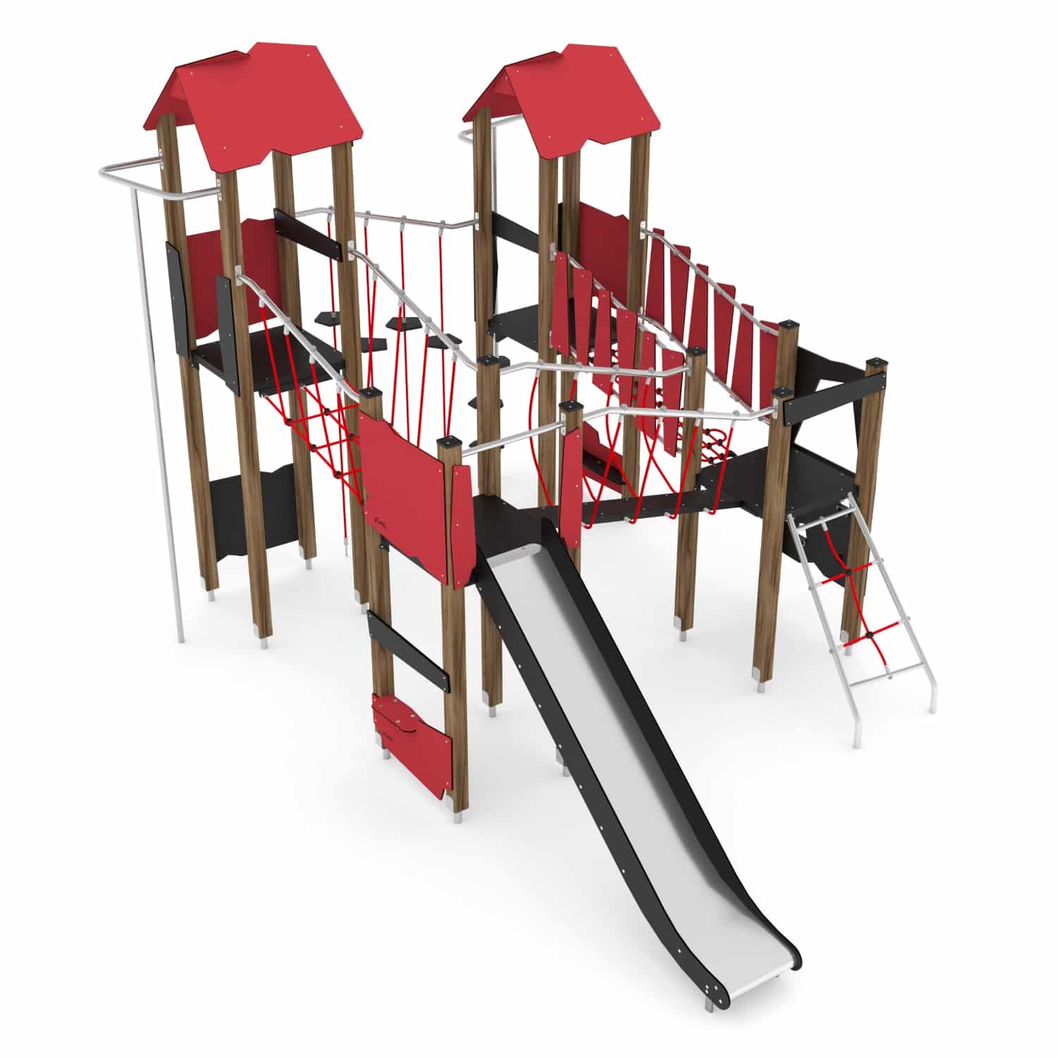 Speelcombinatie met 4 torens, bruggen, klimnet, glijbaan, klim-/glijpaal en brandweerpaal