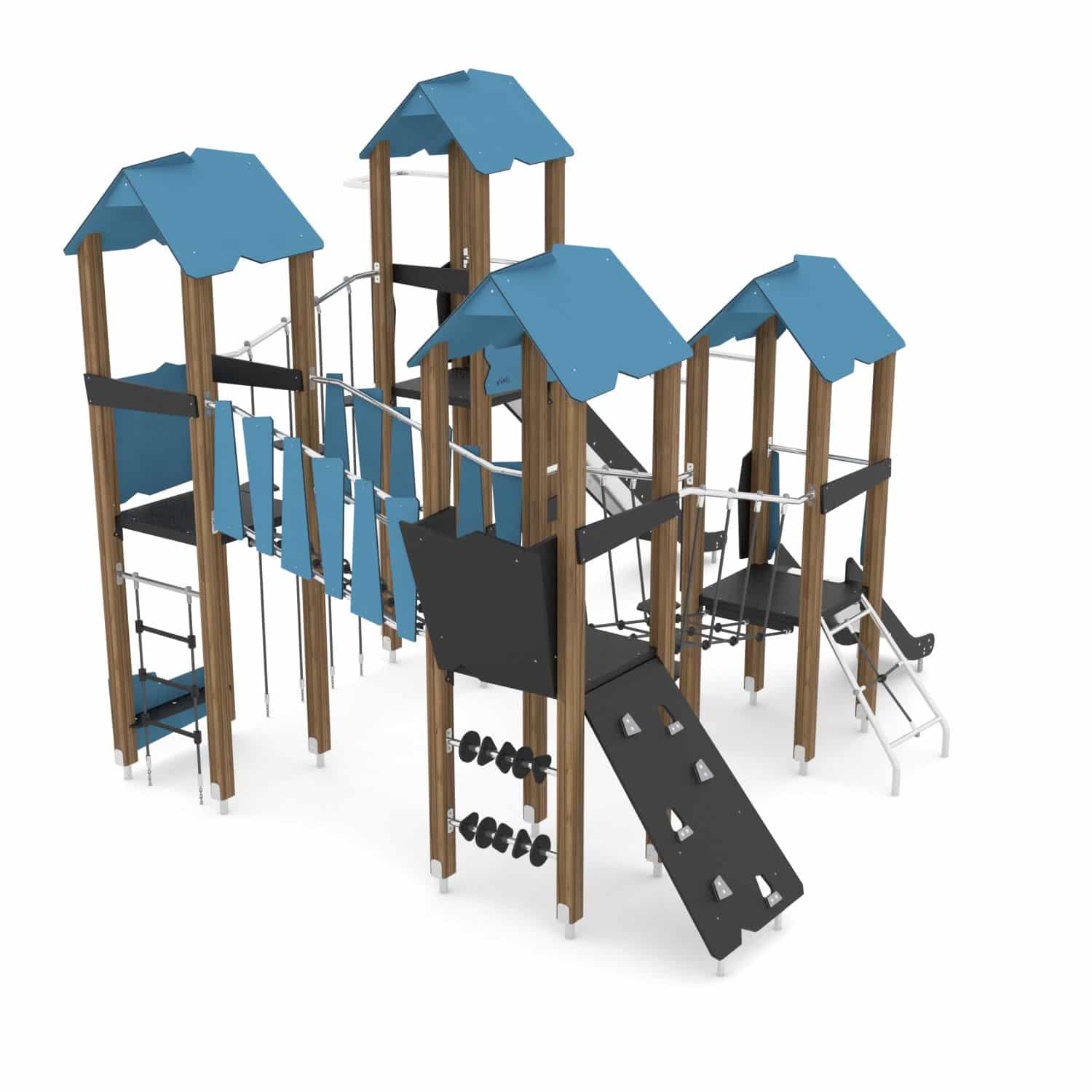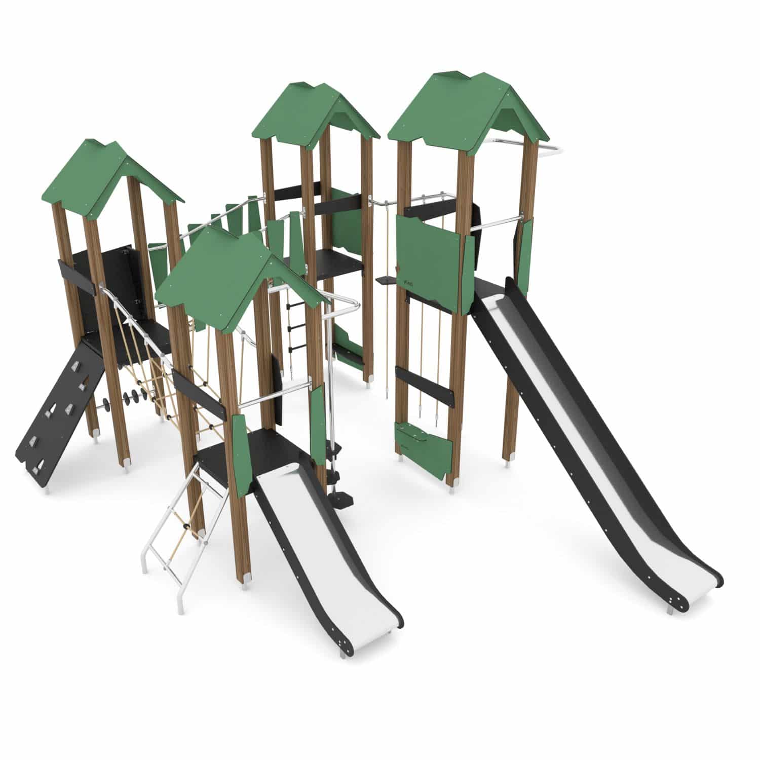 Speelcombinatie met 4 torens, bruggen, klimnet, klim-/glijpaal, brandweerpaal, hoge en lage glijbaan