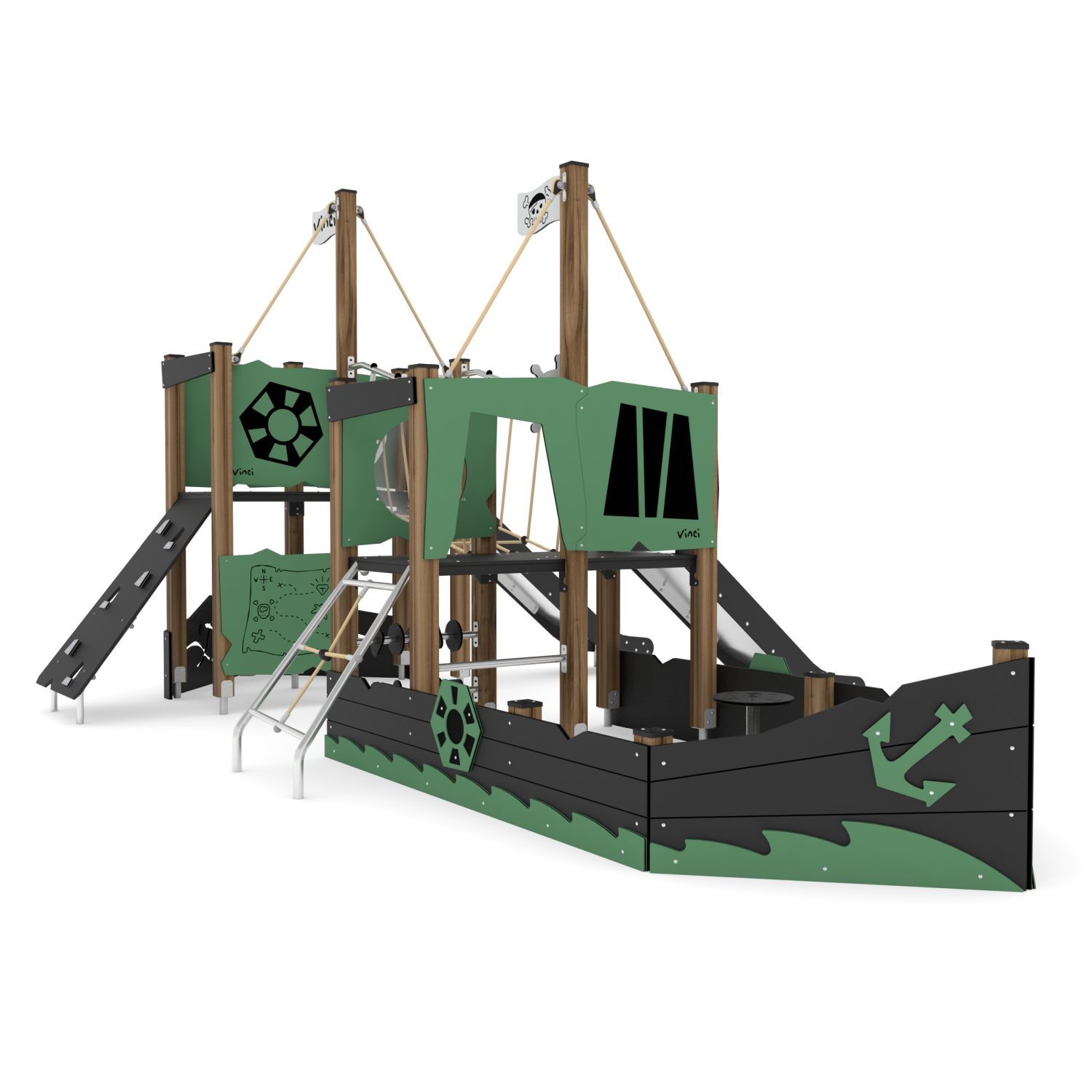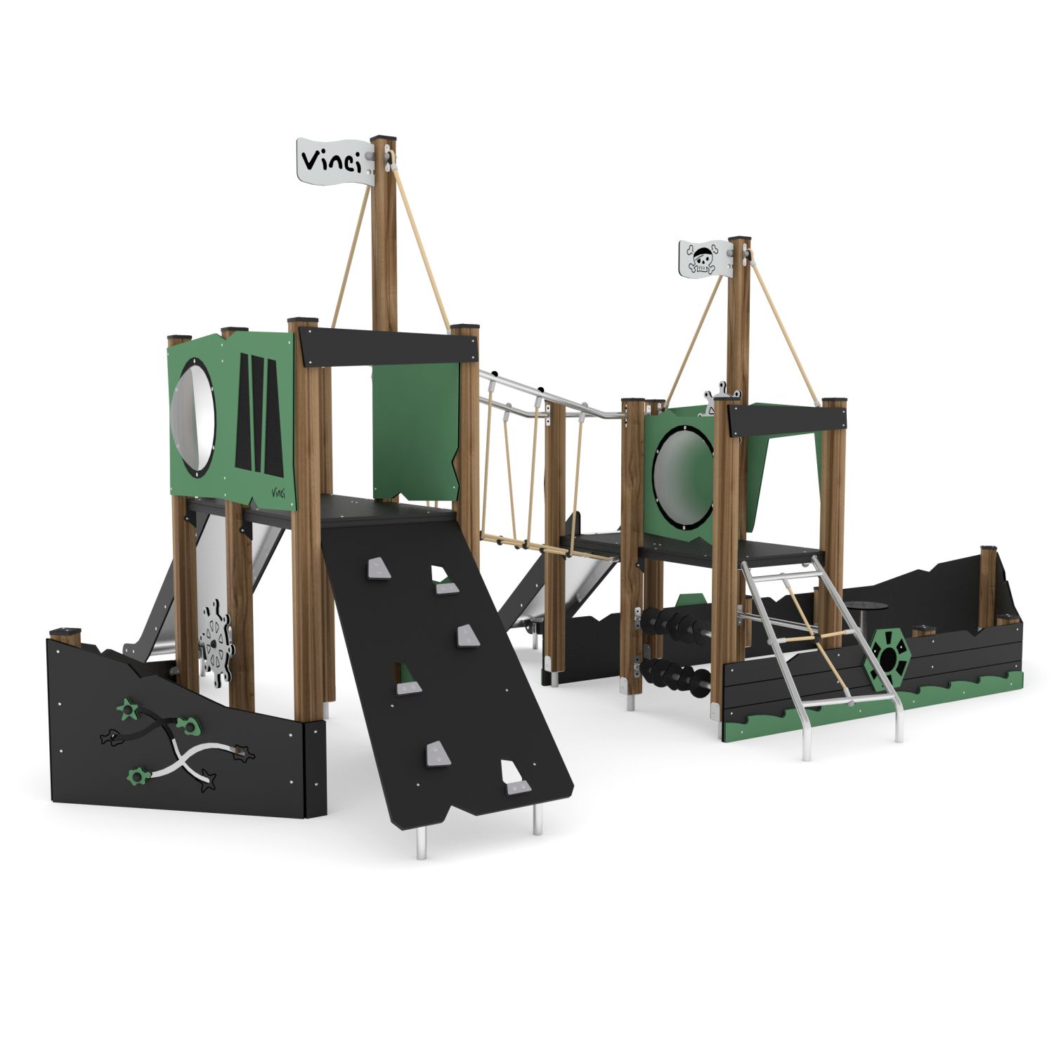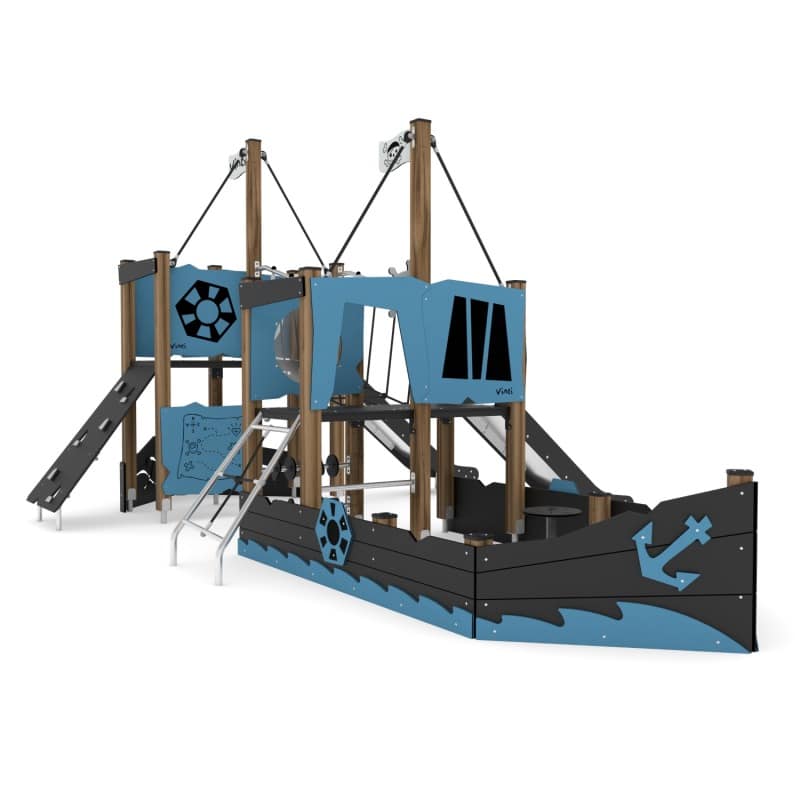 Superspeelschip uit het Wooden programma.    Dubbele torens, twee glijbanen, kompas, schatkaart, klimhelling en Klimnet.  Een echt Piratenschip!
