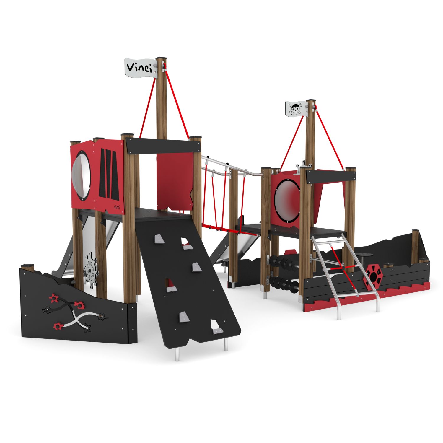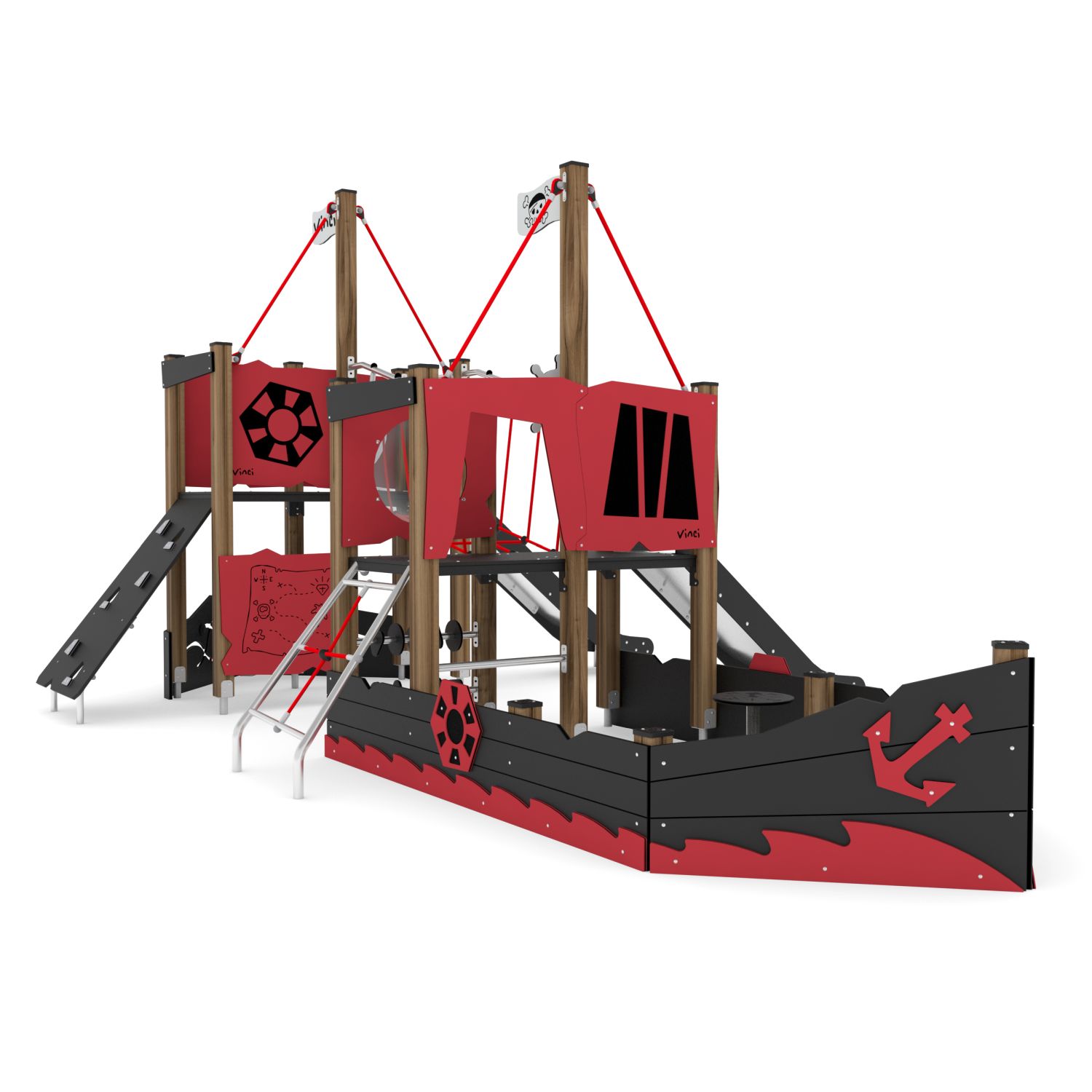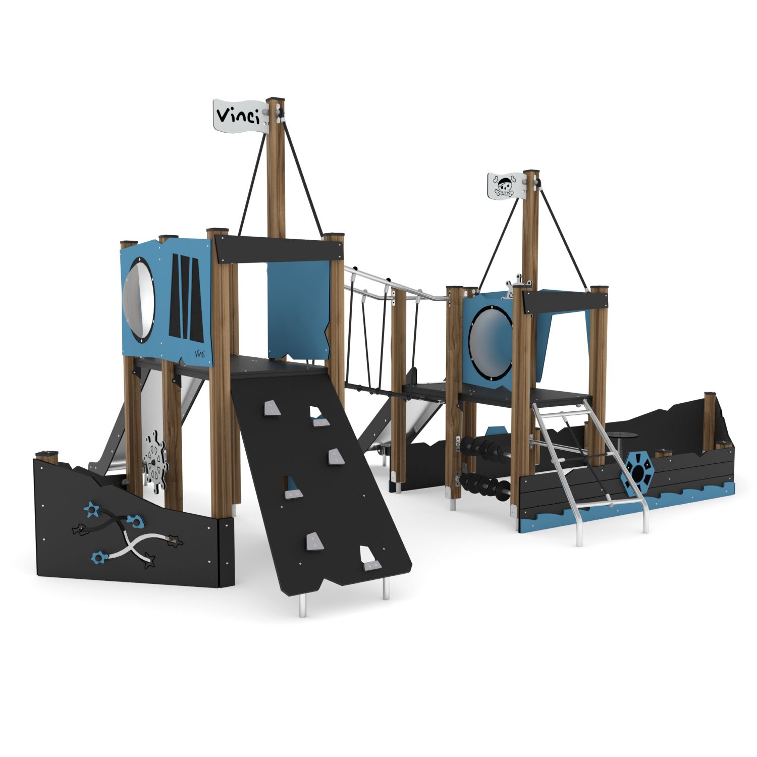 Superspeelschip uit het Wooden programma.    Dubbele torens, twee glijbanen, kompas, schatkaart, klimhelling en Klimnet.  Een echt Piratenschip!