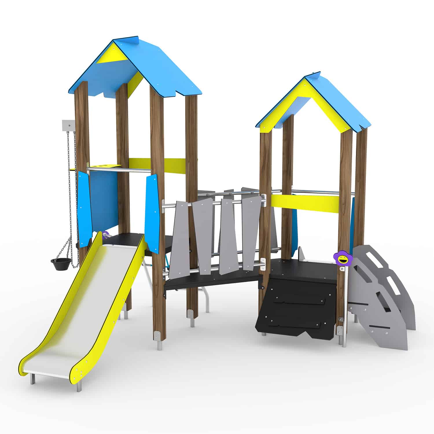 Speelcombinatie met 2 torens, brug, glijbaan, klimnet, kletsbloemen en zandtakel