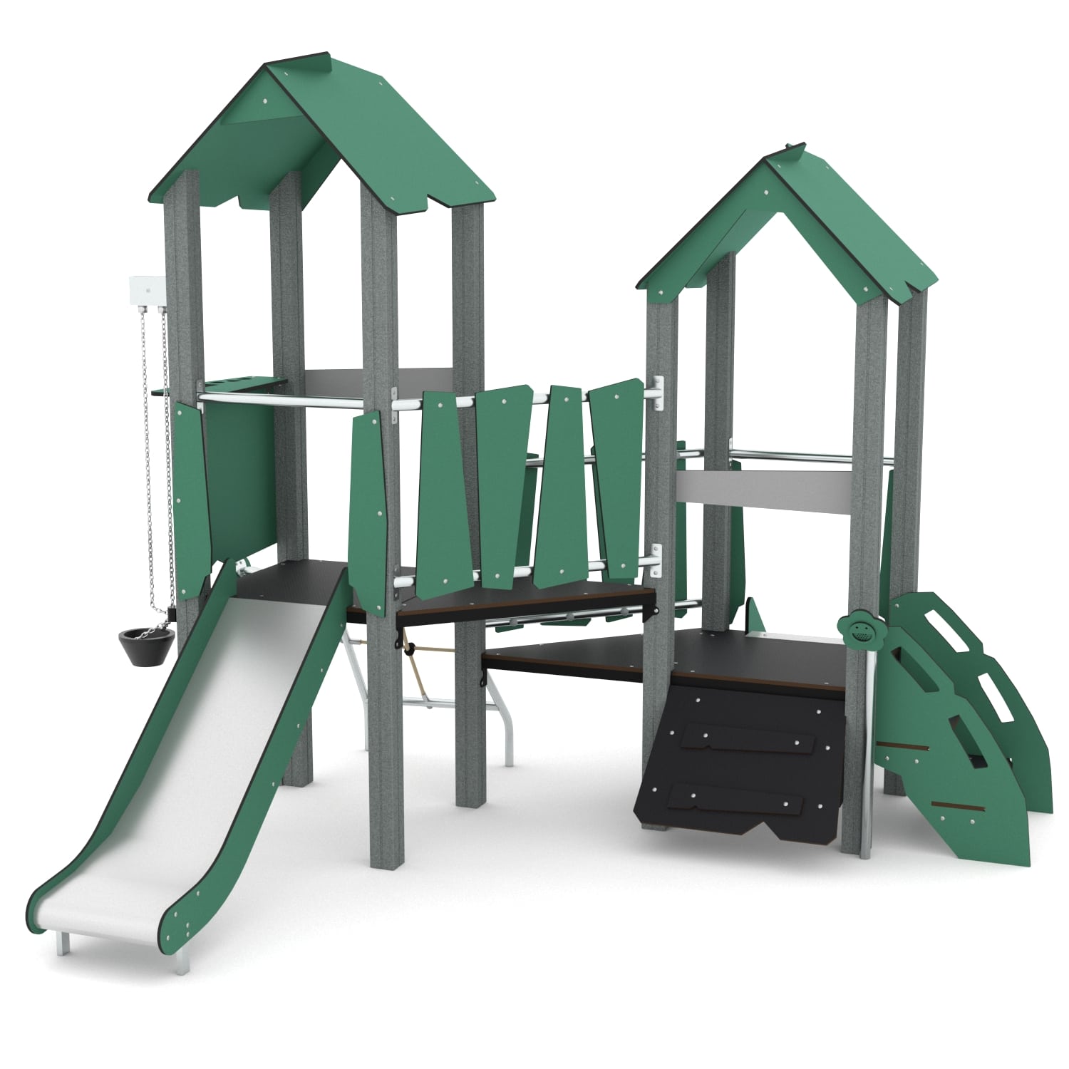 Speelcombinatie met 2 torens, brug, glijbaan, klimnet, kletsbloemen en zandtakel