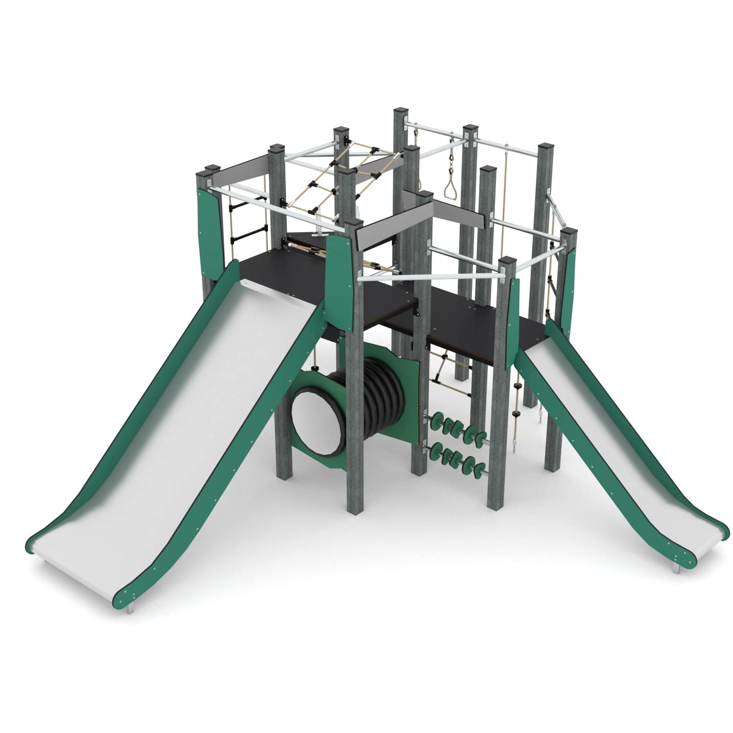 Speelcombinatie met klimnetten, glijstangen standaard en brede glijbaan