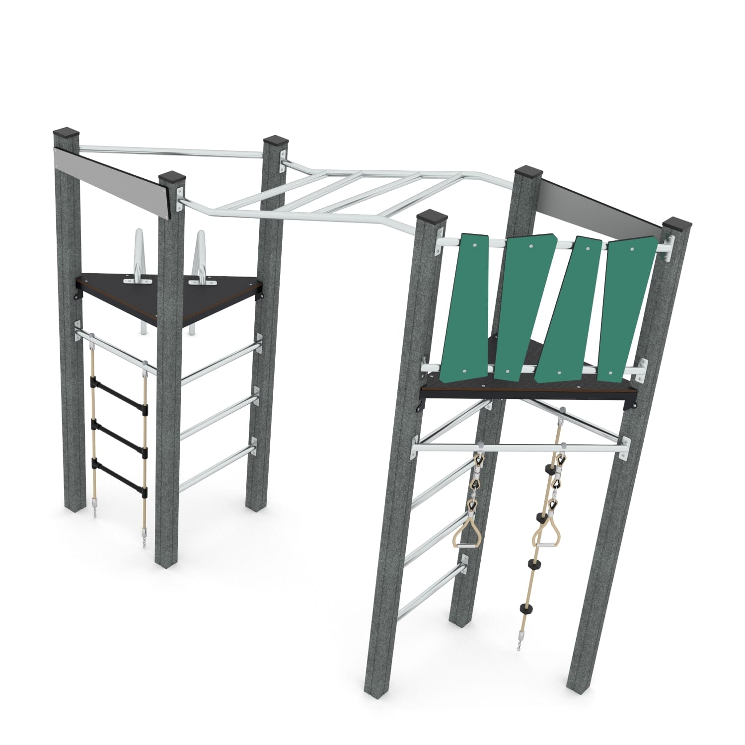 Speelcombinatie met 2 torens, hangbrug en glijstangen