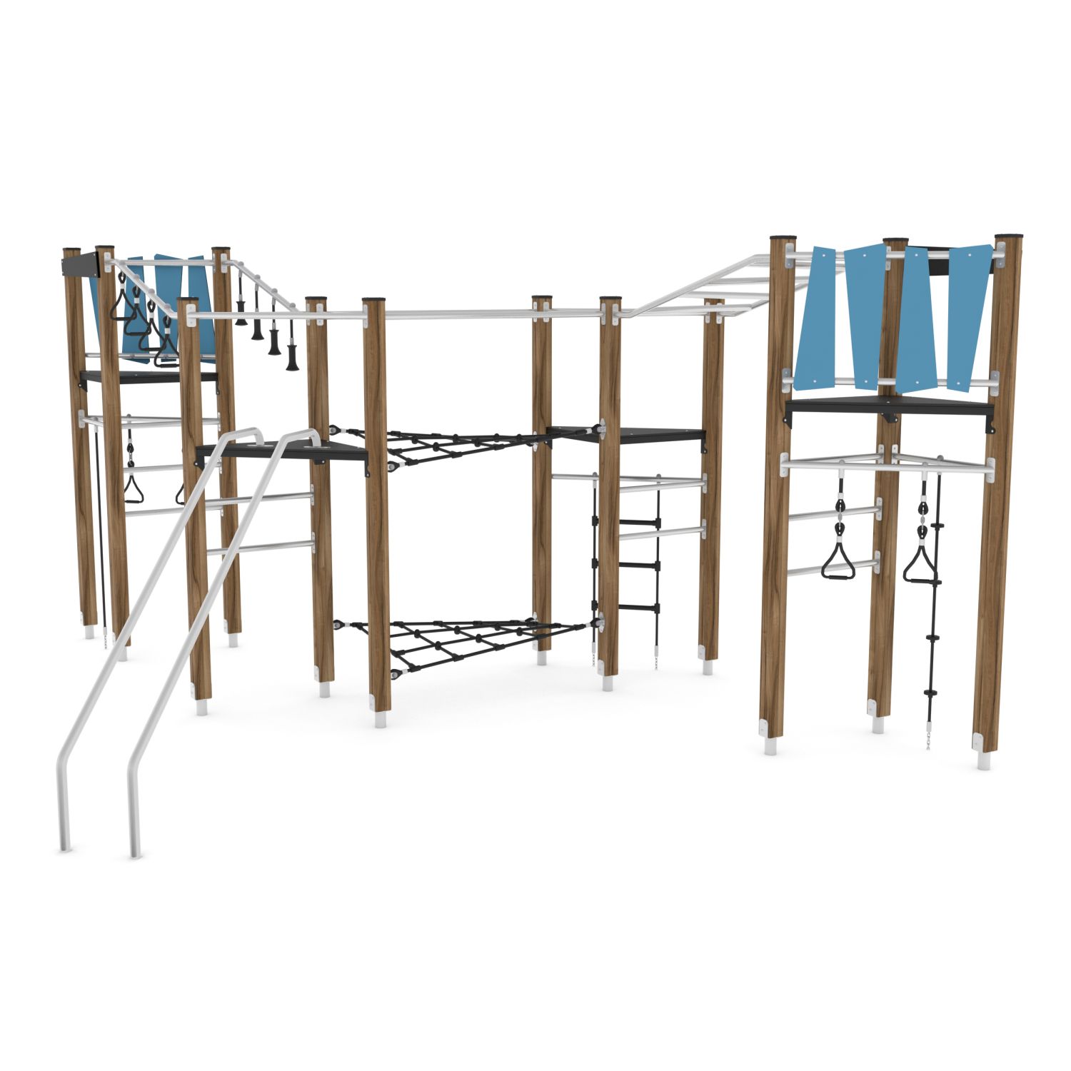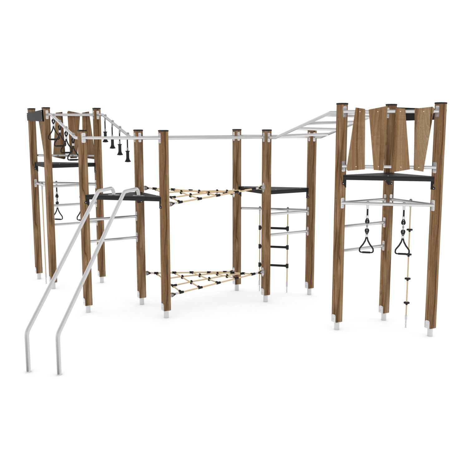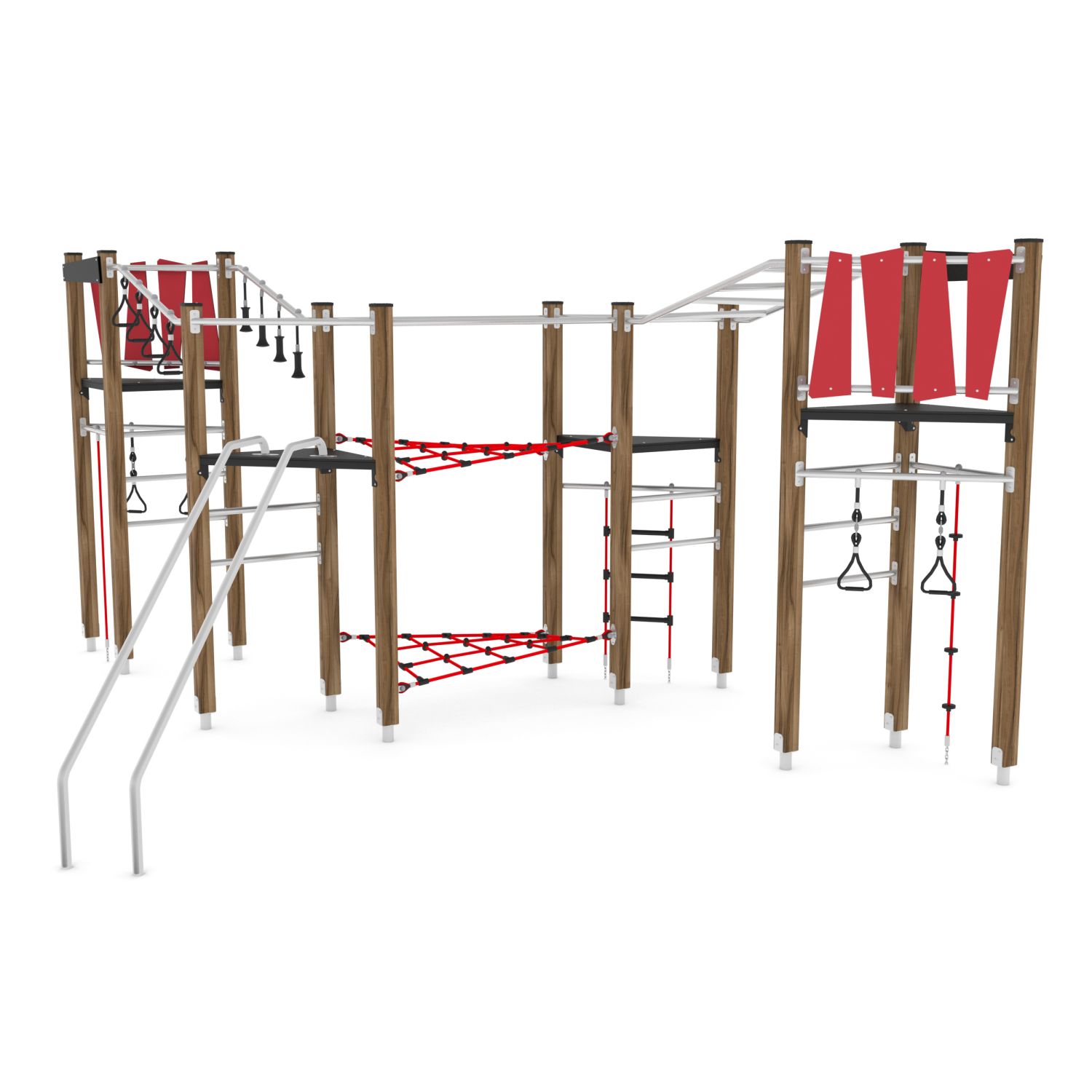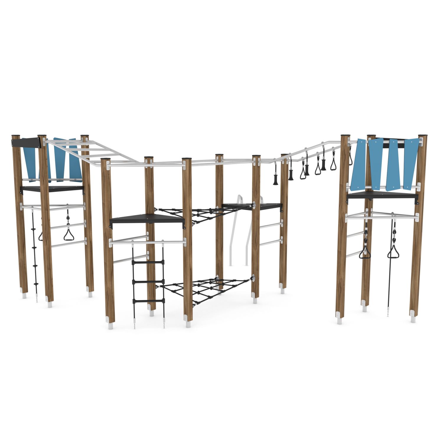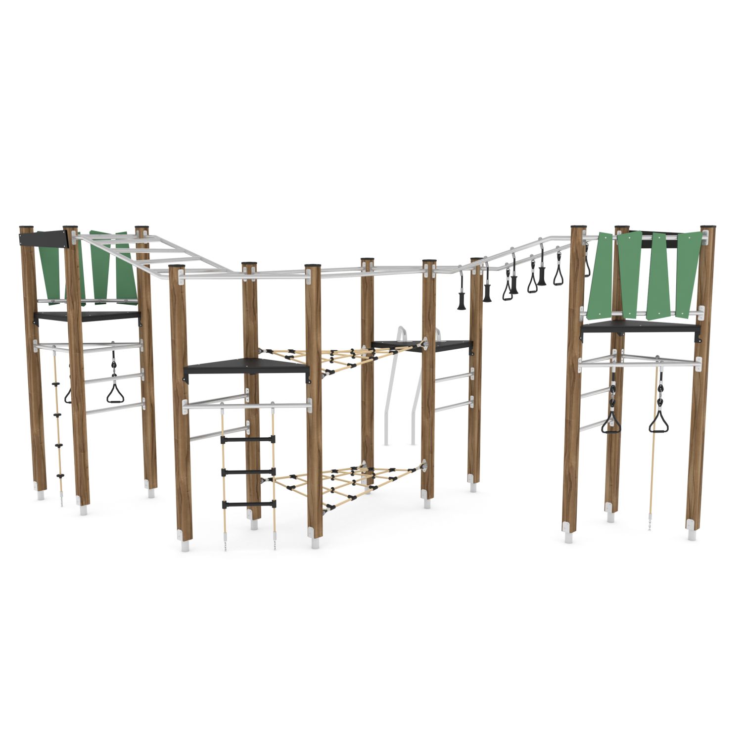 Klimparcours met 4 torens, hangbruggen en klimnetten en glijstangen