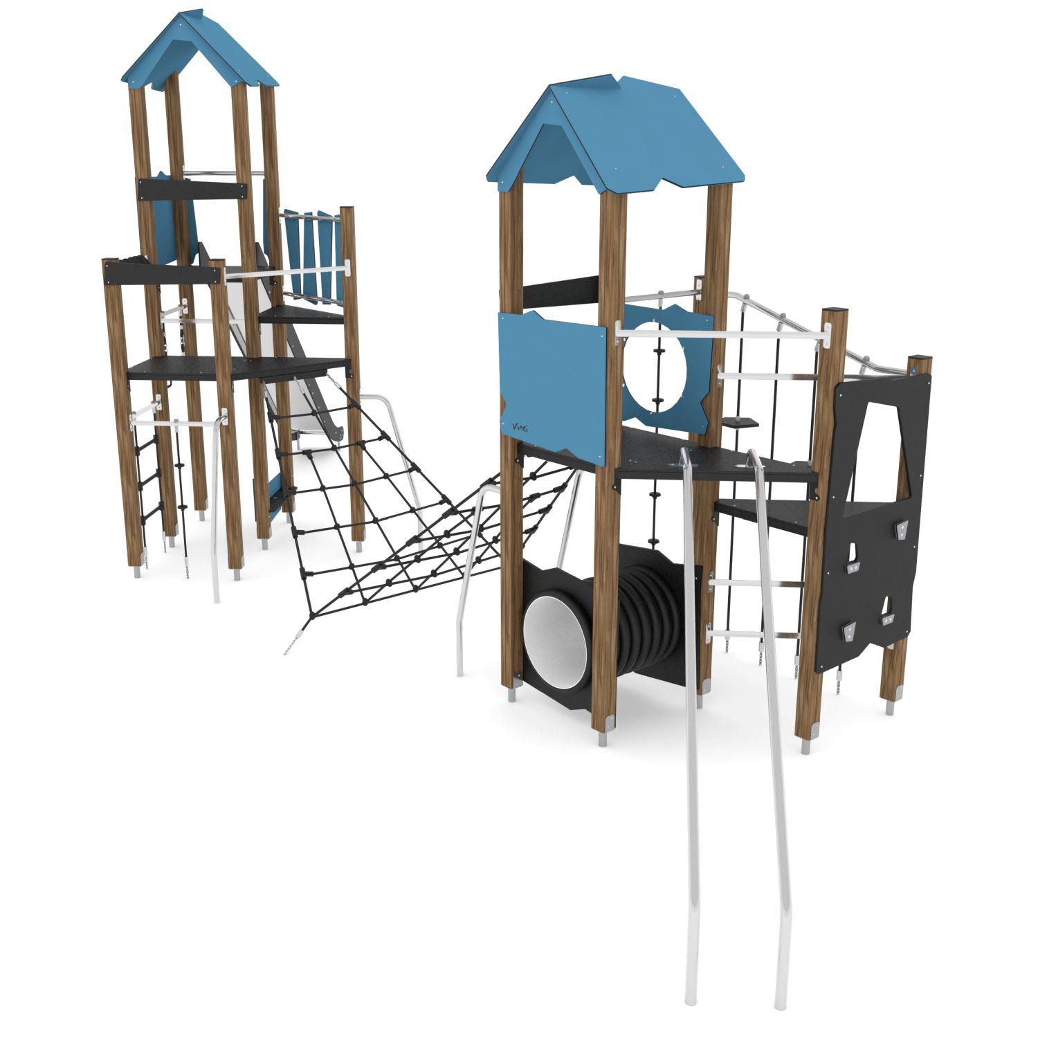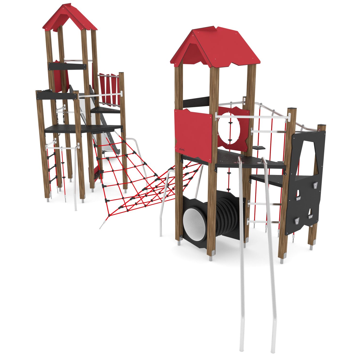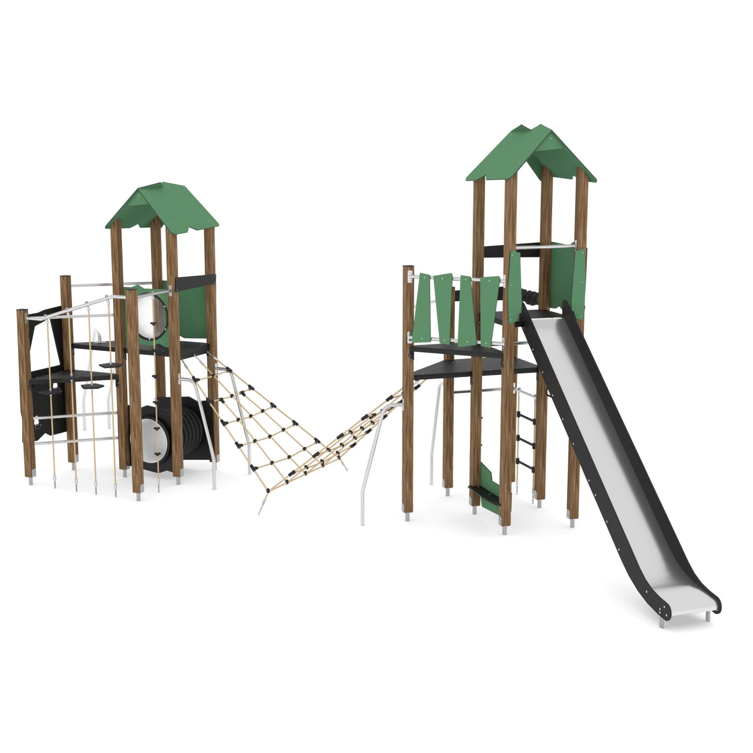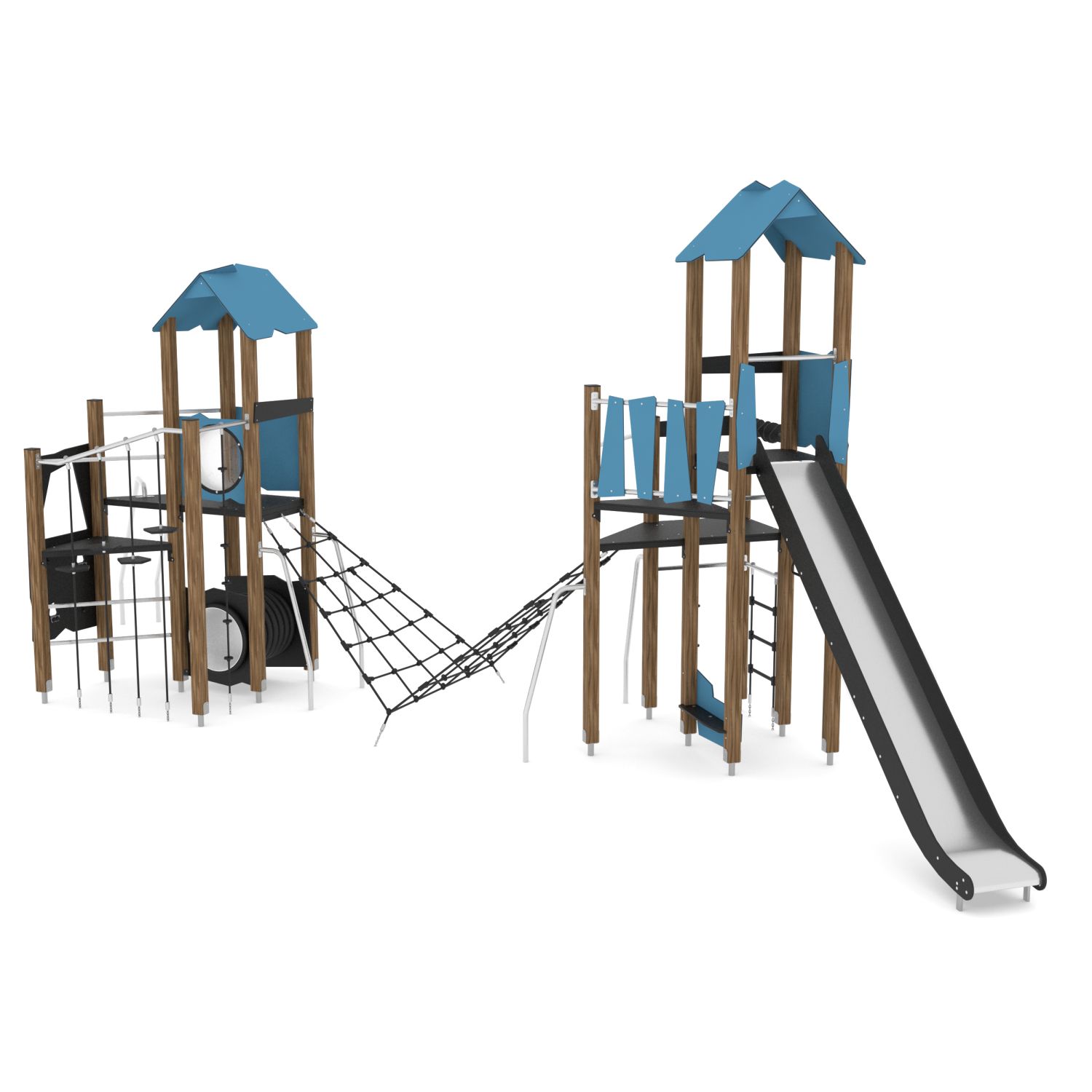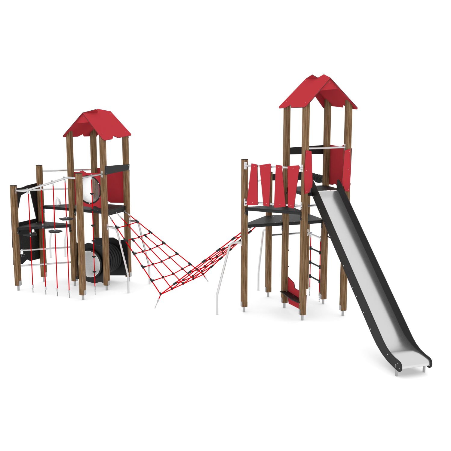 Dubbele speelcombinatie met net verbinding, hoge glijbaan en glijstangen.