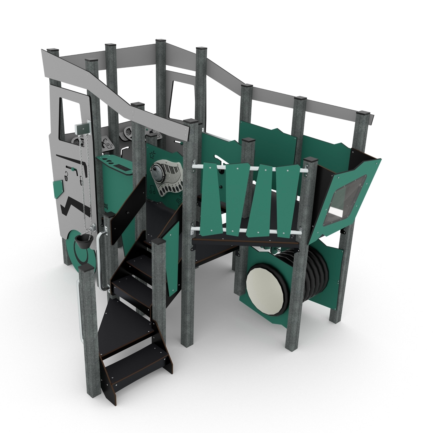 De Recycled Serie. Duurzaam en circulair; de basis van deze toestellen zijn 100% ge-upcycled kunststof staanders – gemaakt uit kunststof folie’s en textiel afval restanten.  Al het plaatwerk bestaat uit 100% ge-upcycled Oceaan kunststof afval zoals opgeviste netten en andere plastics. Het eind resultaat van deze toestellen mag er zeker zijn! Prachtige duurzame toestellen die, door hun uitstraling zeer goed in een natuurlijke omgeving passen. De levensduur van deze speeltuigen is uiteindelijk eigenlijk onbeperkt… Als u na jarenlang speelplezier er op uit gespeelt bent,  gaan ze gewoon weer opnieuw het recycleproces in en kunnen ze weer als nieuwe toestellen terug op de speelplek komen.