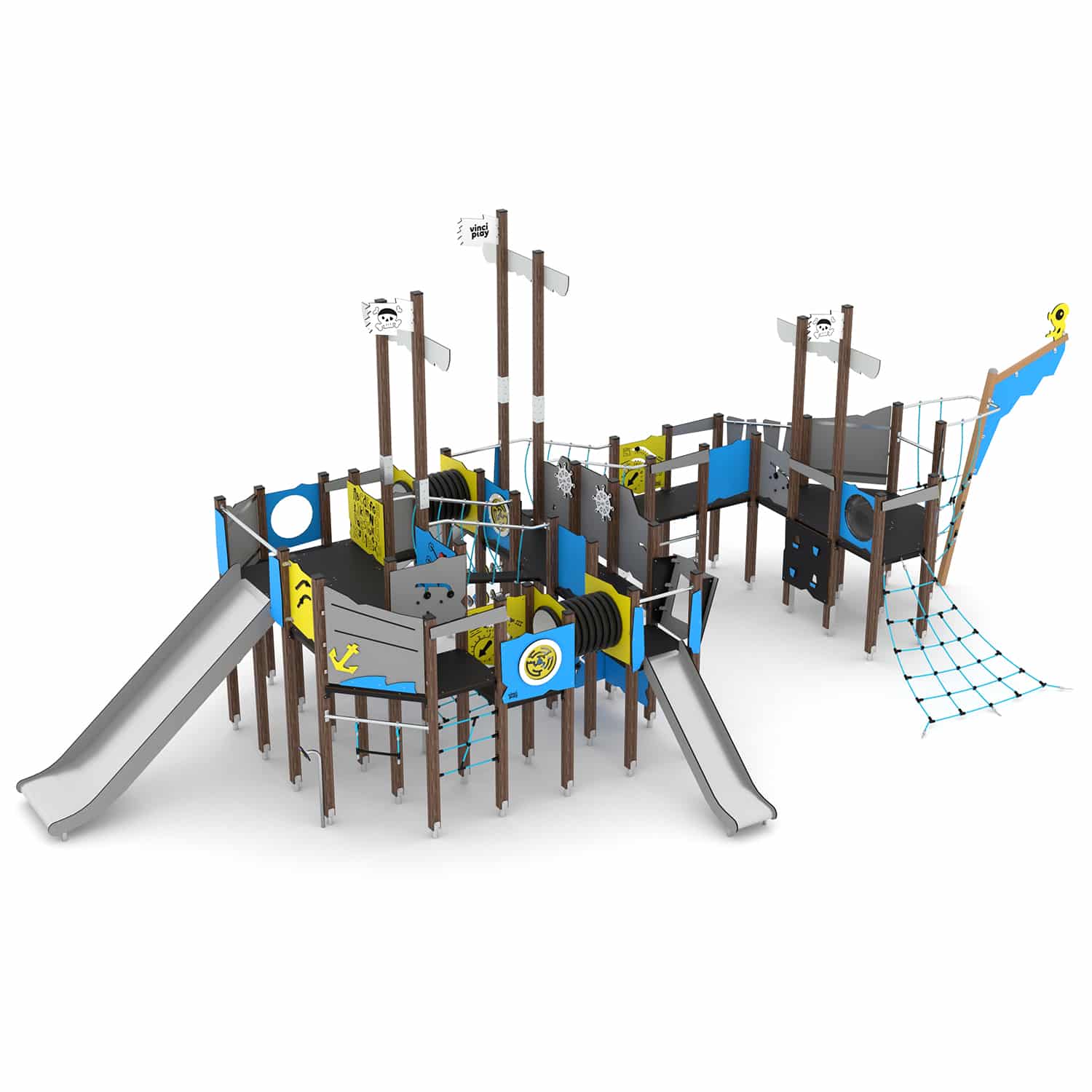 Dit enorme speelschip beschikt over meerdere glijbanen, klim- en klauterelementen. Het thematische aspect van een schip is nog immens populair wat ook terug te zien is in het rollenspel op de speelplek.