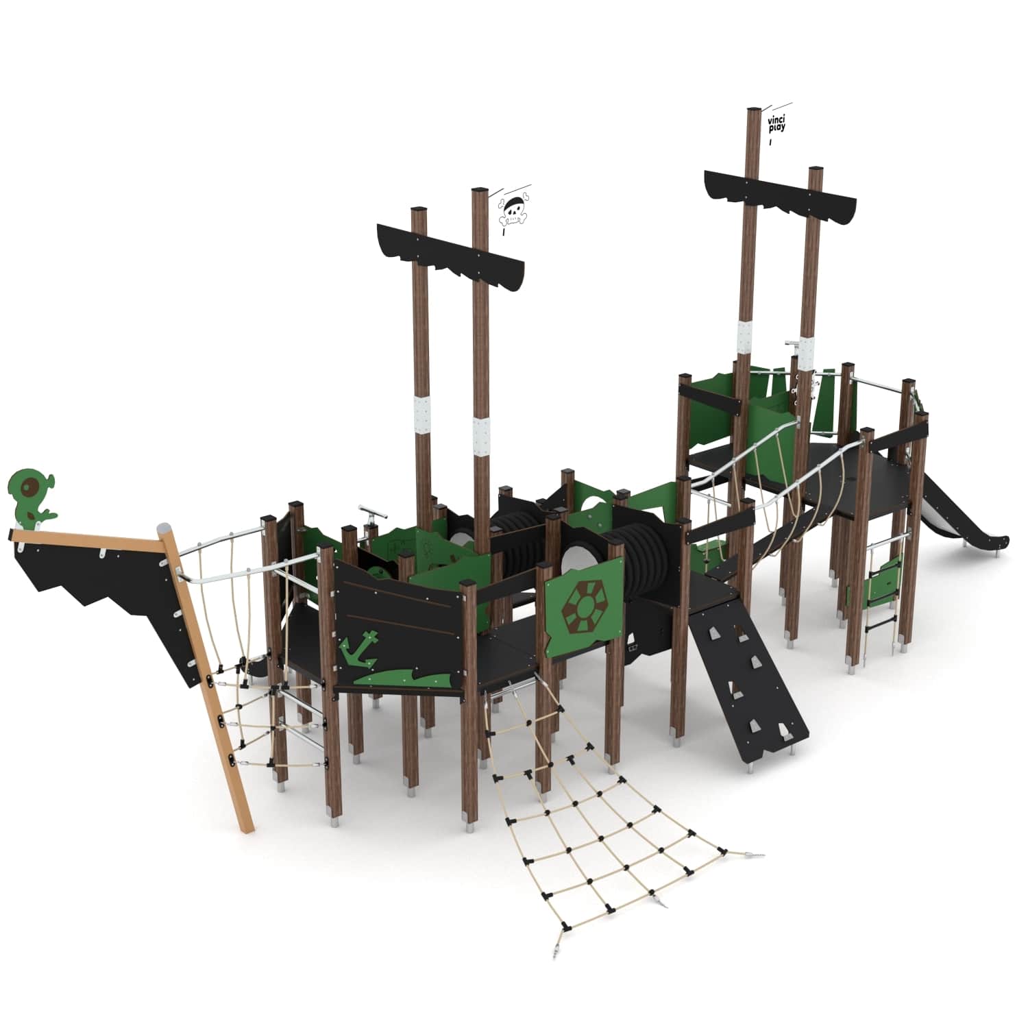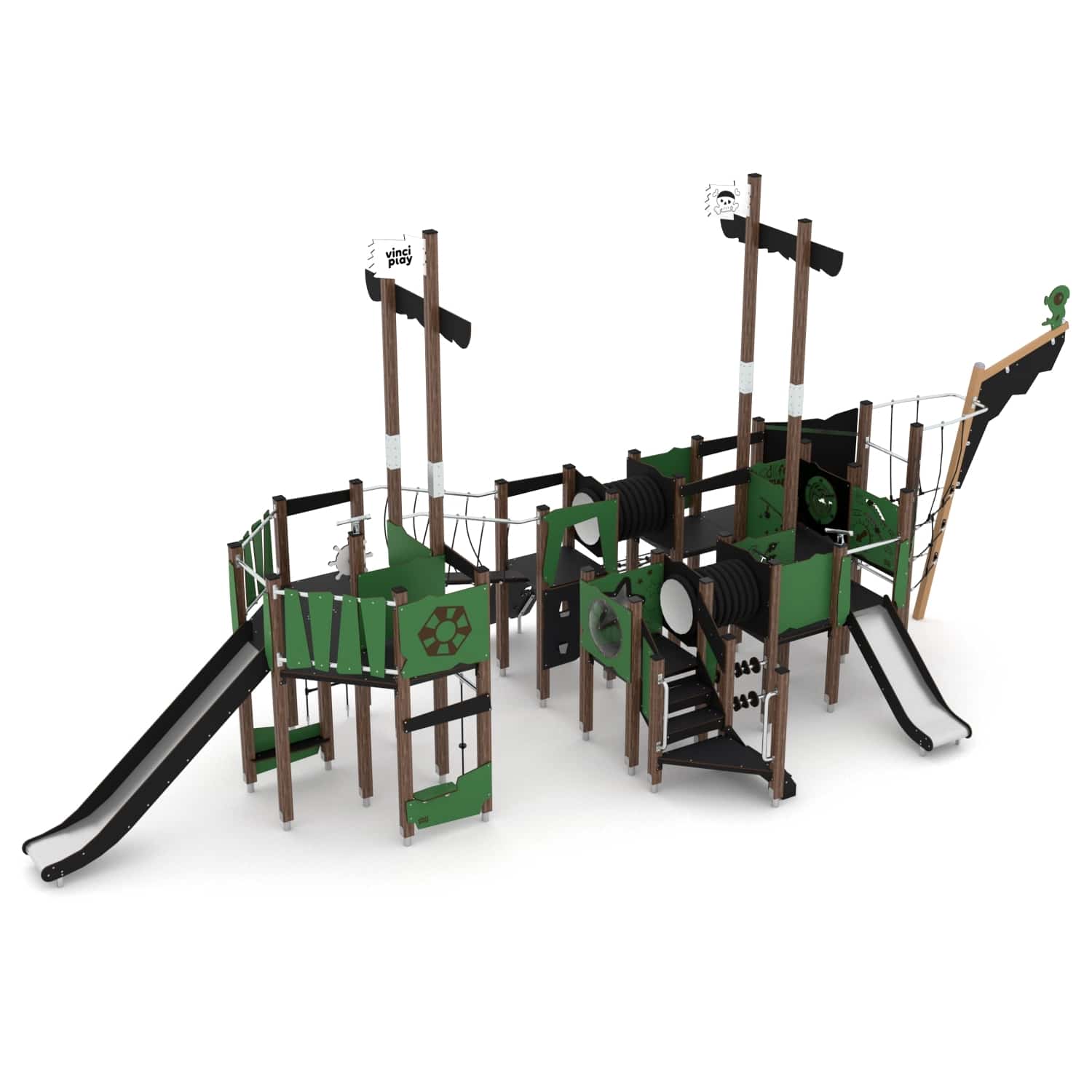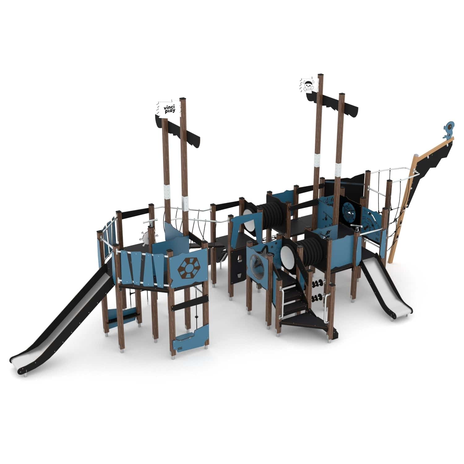 Dit enorme speelschip beschikt over meerdere glijbanen, klim- en klauterelementen. Het thematische aspect van een schip is nog immens populair wat ook terug te zien is in het rollenspel op de speelplek.