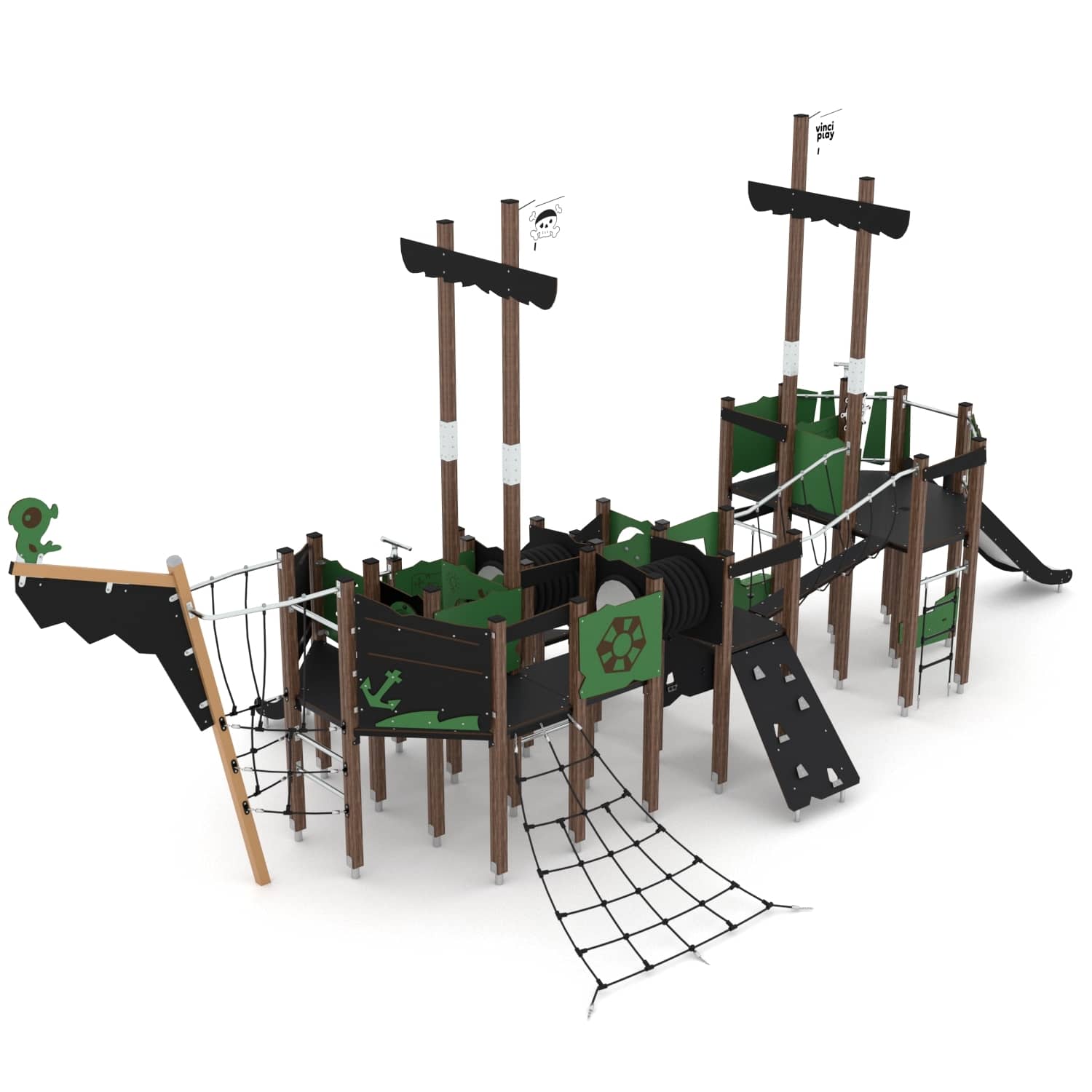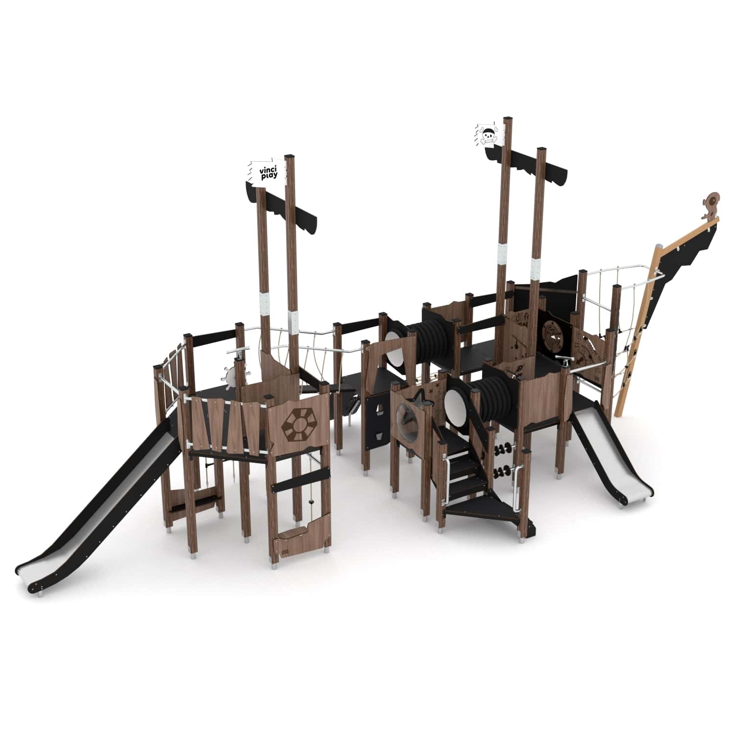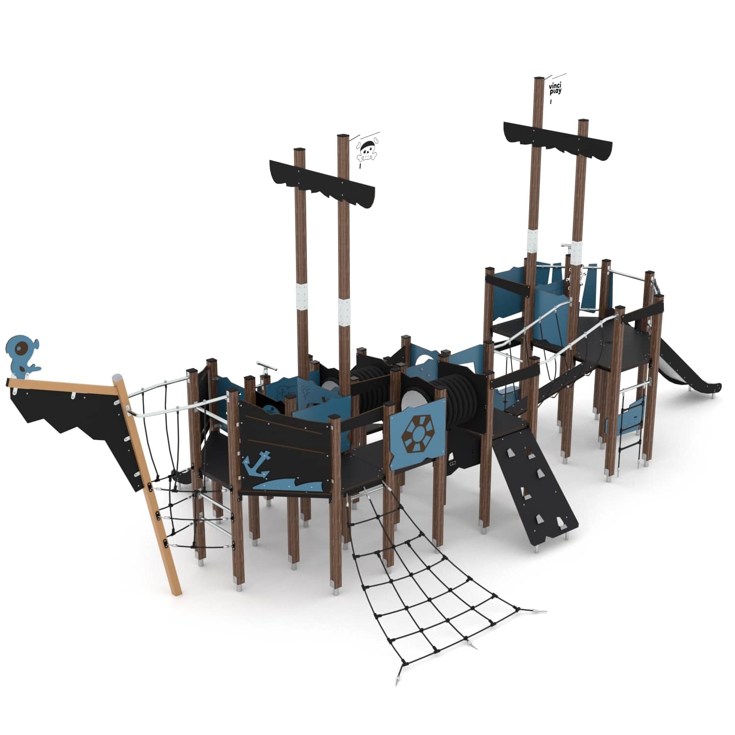 Dit enorme speelschip beschikt over meerdere glijbanen, klim- en klauterelementen. Het thematische aspect van een schip is nog immens populair wat ook terug te zien is in het rollenspel op de speelplek.