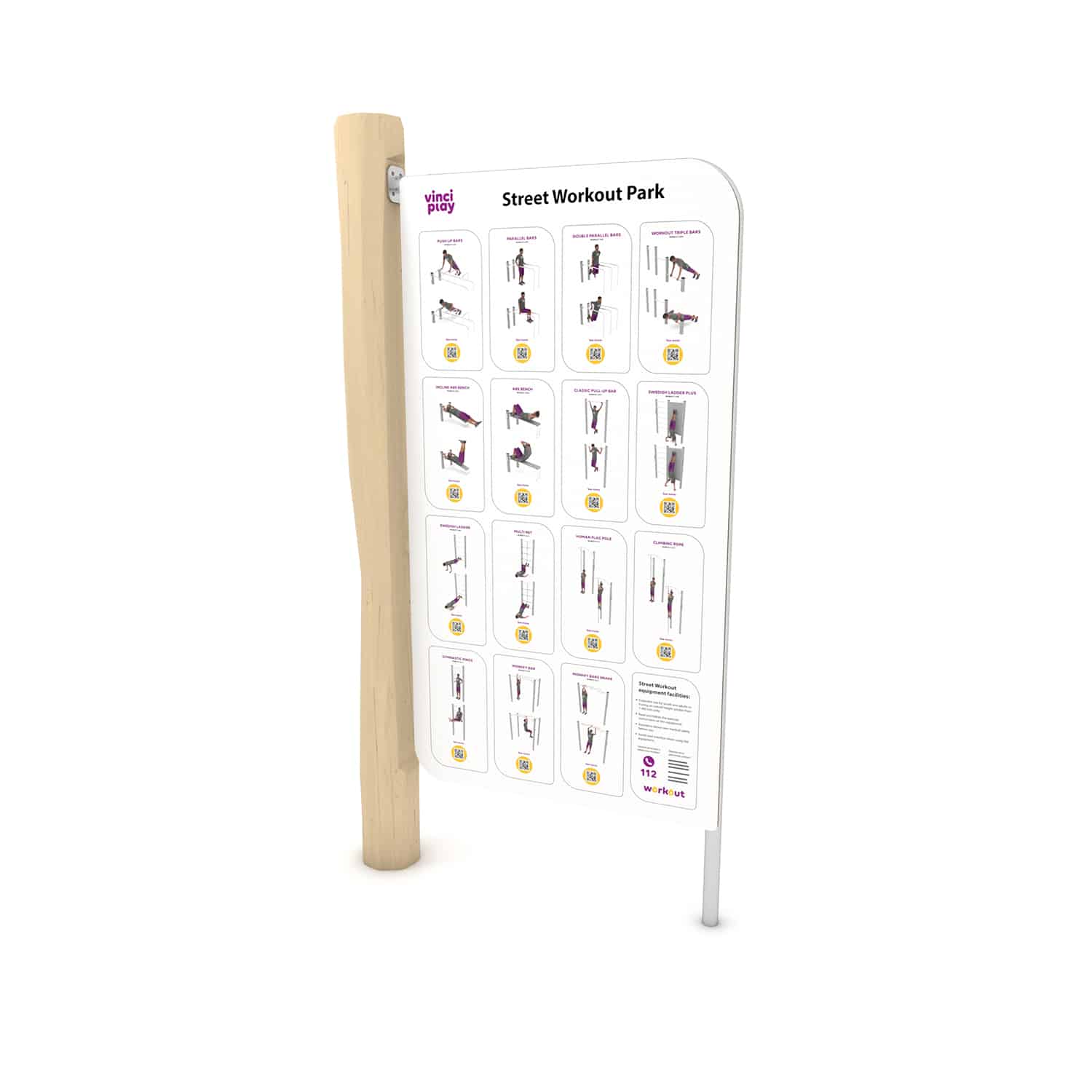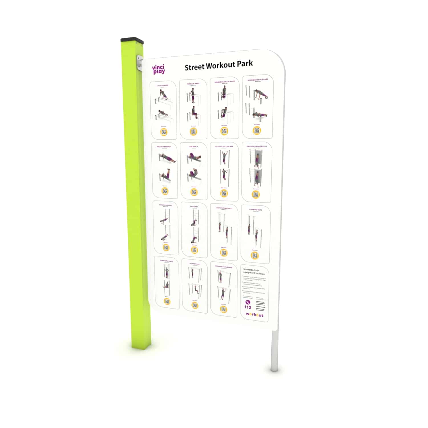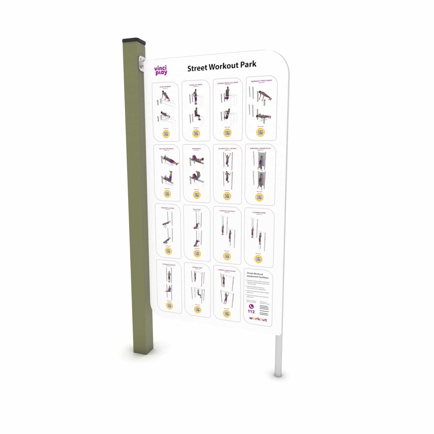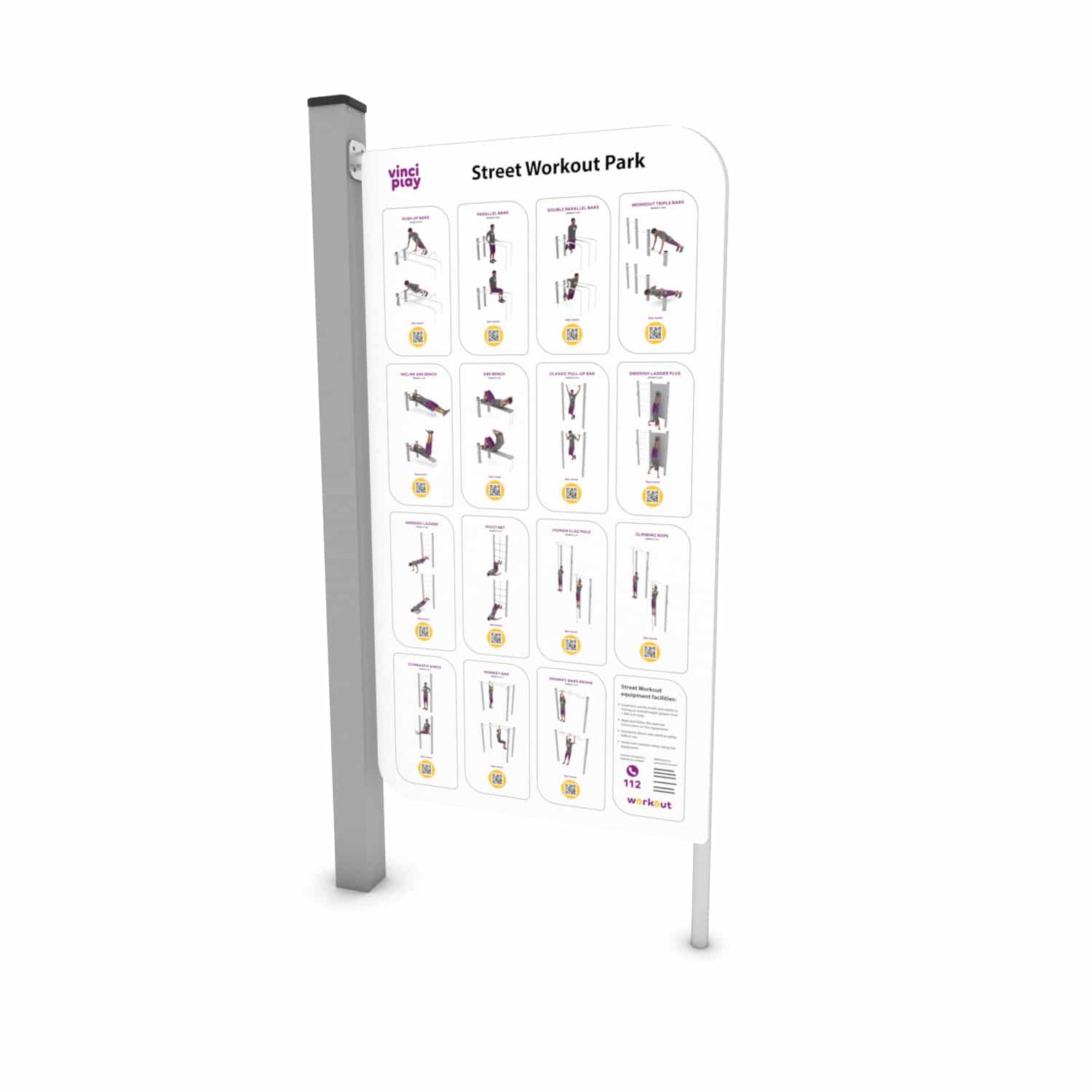 Om jouw trainingsschema samen te stellen of de verschillende oefeningen te begrijpen is een instructiebord leverbaar. Het element heeft een robuust stalen frame dat is verzinkt en voorzien van een hoogwaardige poedercoating.